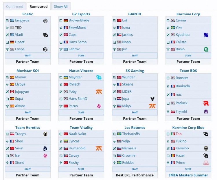 而随着FNC敲定阵容,LEC各队下赛季阵容也已经全部确定。G2、GX、MKOI三支队伍在休赛期并未作出阵容调整,FNC签下前KC中单Vladi。KC则签下DRX中单Kyeahoo和FLY辅助Busio。FNC辅助Mikyx则加盟SK并携手Wunder。前FNC中单Humanoid则加盟Vitality。