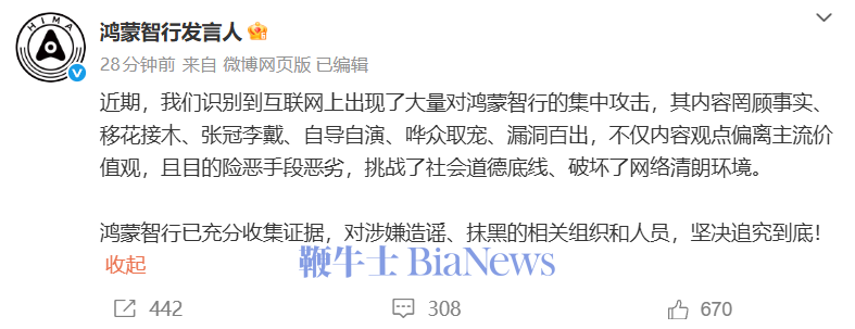 鸿蒙智行方面表示,已充分收集证据,并对涉嫌造谣、抹黑的相关组织和人员坚决追究到底。