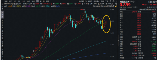 盘面上,今日(11月27日)百分百布局新质生产力的硬科技宽基——双创龙头ETF(588330)场内价格一度大涨超3%,现涨1.93%,冲击日线3连涨,盘中收复60日均线,实时成交额超5000万元,交投火热!技术面或显示为多方力量反攻的积极信号!