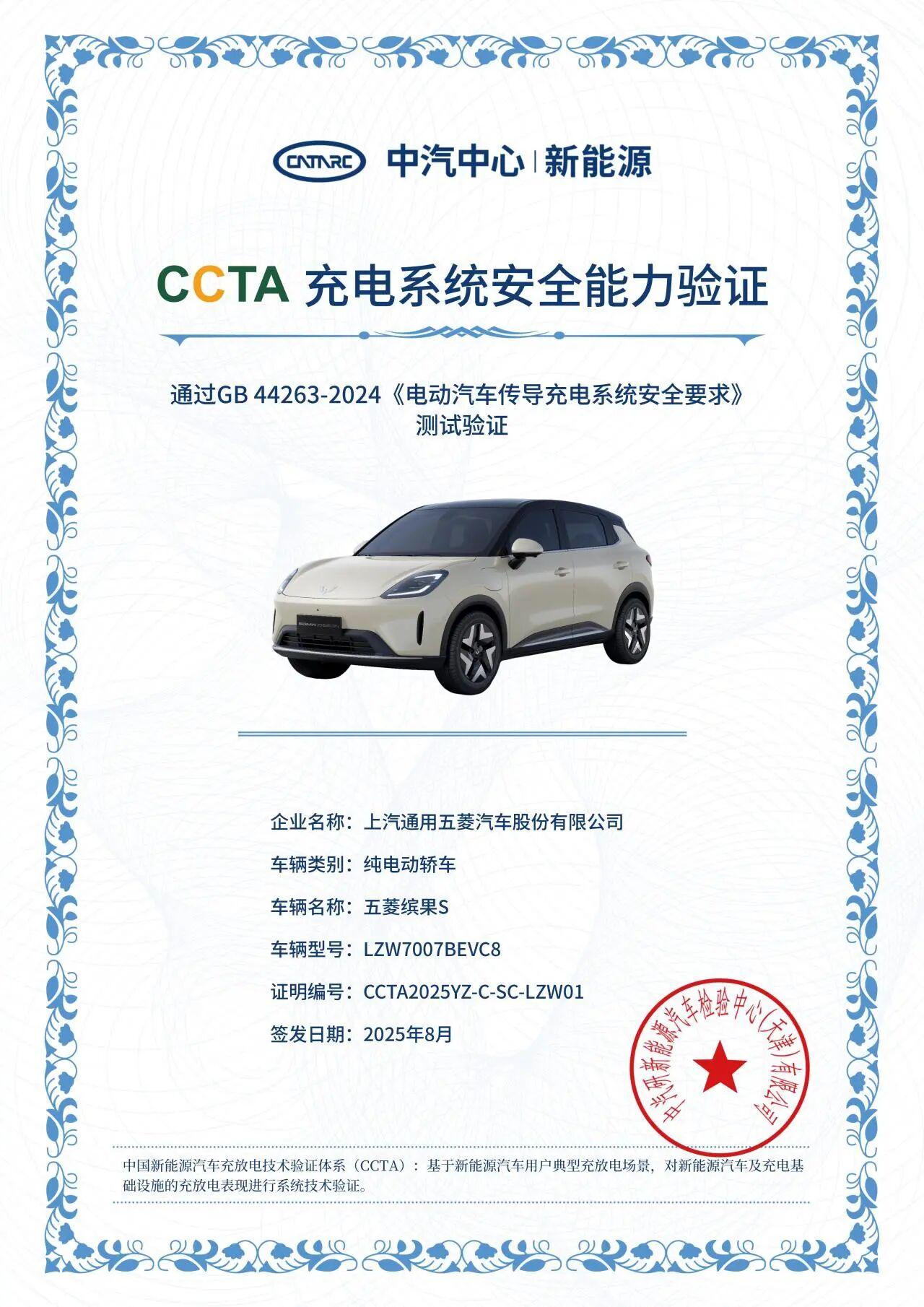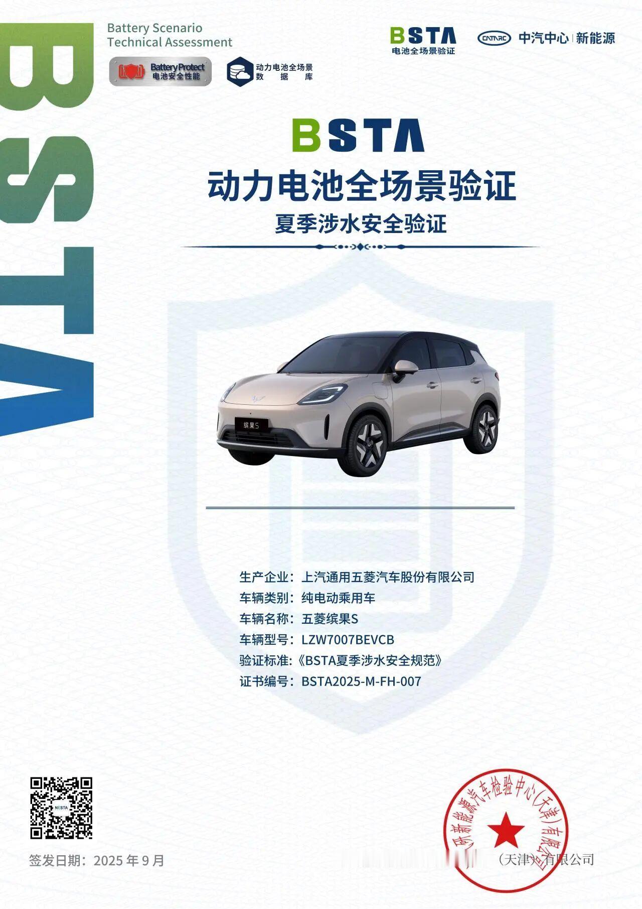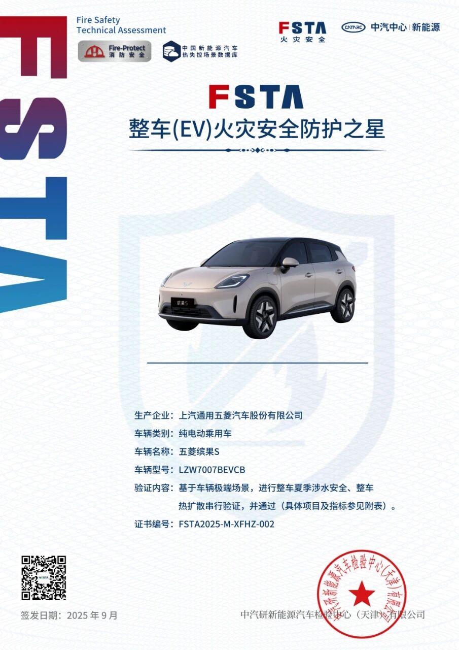 上汽通用五菱缤果S荣获四项权威认证,电池安全与性能实力出圈。近日,在2025第三届新能源汽车电安全大会上,缤果S荣获中汽中心“BSTA动力电池全场景验证夏季涉水安全验证”及“FSTA整车EV火灾安全防护之星”双项荣誉。此前,上汽通用五菱缤果S已成功斩获CCTA充电新国标功能验证及CCTA充电系统安全能力验证两项证书。