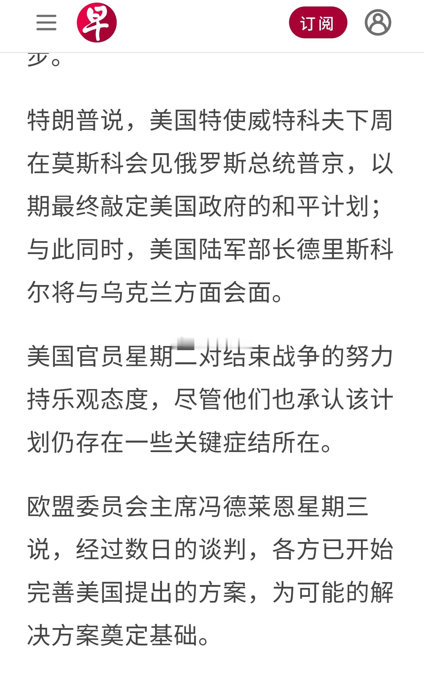 俄方称拒绝任何让步克里姆林宫星期三(11月26日)说,俄罗斯已看过美国提出的结束俄乌战争的计划草案的最新版本,并对其中一些内容持积极态度,但希望就其他部分进行讨论。克里姆林宫助手乌沙科夫在接受俄罗斯国家电视台记者采访时说,新草案需要“真正认真的分析”,俄罗斯尚未与任何人讨论过该草案。特朗普说,美国特使威特科夫下周在莫斯科会见俄罗斯总统普京,以期最终敲定美国政府的和平计划;与此同时,美国陆军部长德里斯科尔将与乌克兰方面会面。美国官员星期二对结束战争的努力持乐观态度,尽管他们也承认该计划仍存在一些关键症结所在。