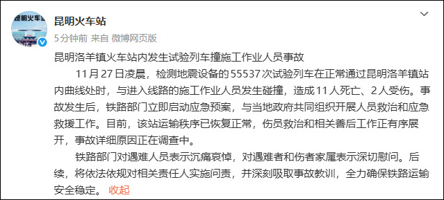 11月27日凌晨,检测地震设备的55537次试验列车在正常通过昆明洛羊镇站内曲线处时,与进入线路的施工作业人员发生碰撞,造成11人死亡、2人受伤。事故发生后,铁路部门立即启动应急预案,与当地政府共同组织开展人员救治和应急救援工作。目前,该站运输秩序已恢复正常,伤员救治和相关善后工作正有序展开,事故详细原因正在调查中。