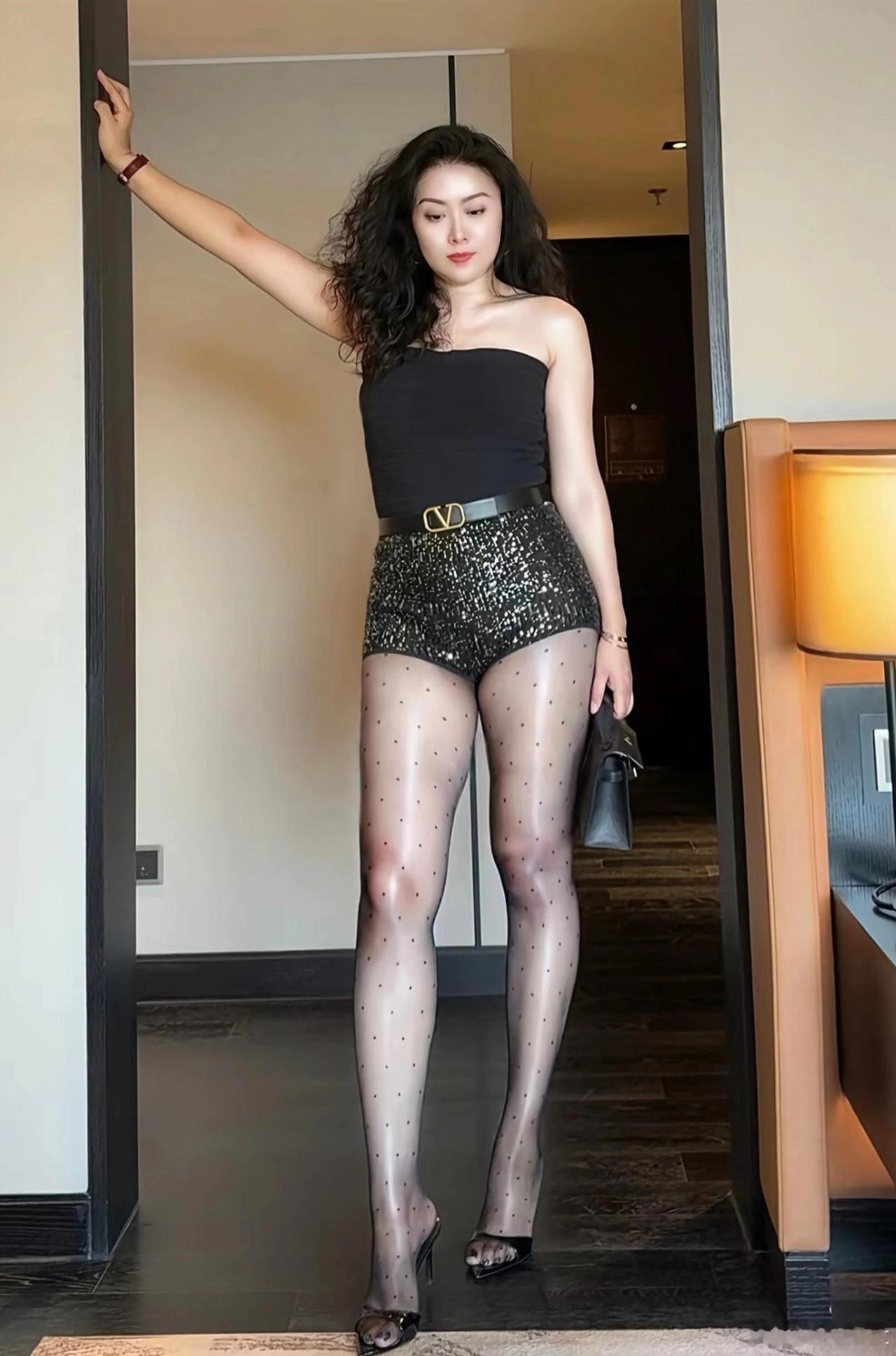 大长腿美女时尚穿搭指南:黑色上衣+闪亮短裤+透视波点丝袜,优雅又迷人!👗👠高