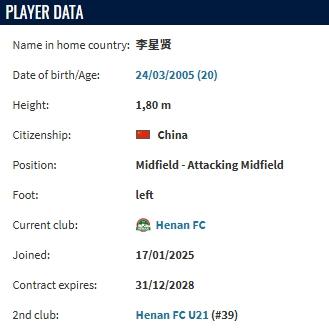 虎扑11月27日讯根据德国转会市场更新数据,河南俱乐部酒祖杜康队已与20岁中场球员李星贤完成续约,新合同至2028年底。