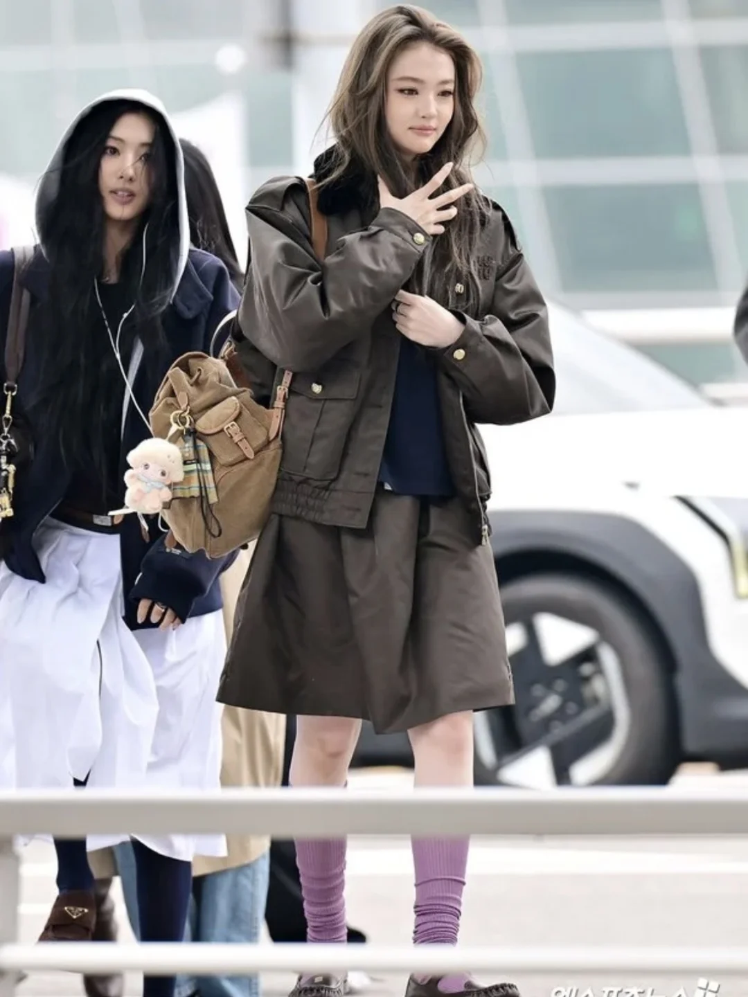 全黑穿搭本来偏冷感,粉紫袜子一露,甜妹氛围直接焊在身上
