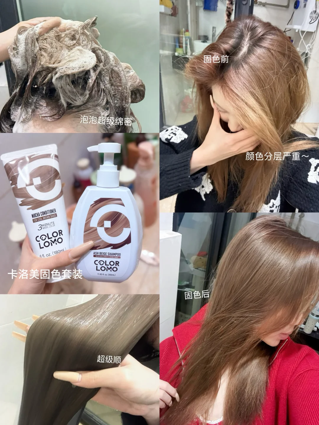 用的比较多的是卡洛美的奶茶灰棕固色一套🧺一般掉色后会先用固色发膜补色,它上色很快,可以少量多次抹匀在头发上等20分钟洗掉⏰然后和平时洗头一样,再用固色洗发水打出泡沫洗一洗,让发色更匀~