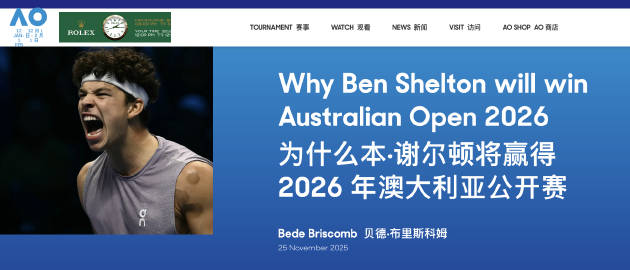 虎扑11月27日讯近日,澳网官方在官网发文预测ATP2026澳网冠军,澳网官方第一个男子造势对象不是最为热门的阿卡或辛纳也不是本土选手德米纳尔,而是美国网球选手谢尔顿,全文如下: