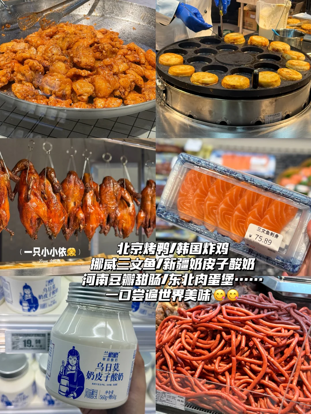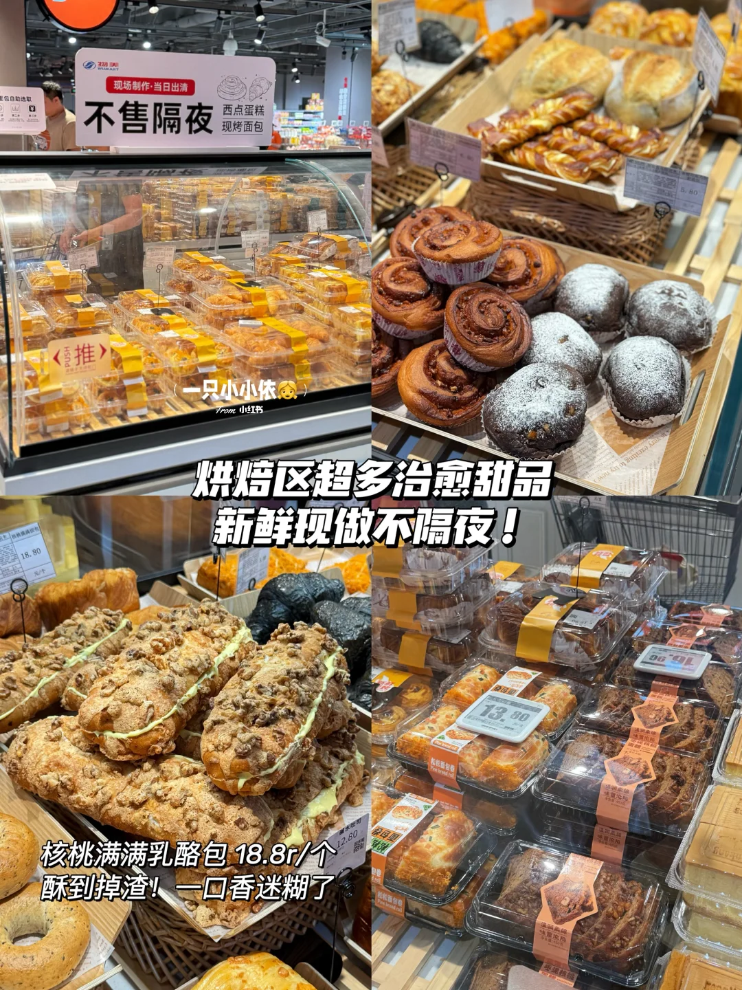 第一站直奔河南胖东来专区🏃♀️100%芒果混合果汁直接拿下,网红大月饼、爆浆马斯卡彭都是新鲜现做,跟我在许昌吃的一模一样🥳第二站来到海鲜水产区,挪威三文鱼入口即化🍣鲜的像刚从海里打捞出来;第三站来到熟食区,北京烤鸭🦆东北肉蛋堡🍔韩式炸鸡应有尽有;第四站来烘焙区邂逅法式酥香,刚出炉的核桃满满乳酪包酥到掉渣✨还有法棍、吐司、蛋挞等治愈甜品🍰面包脑袋一口爱上!