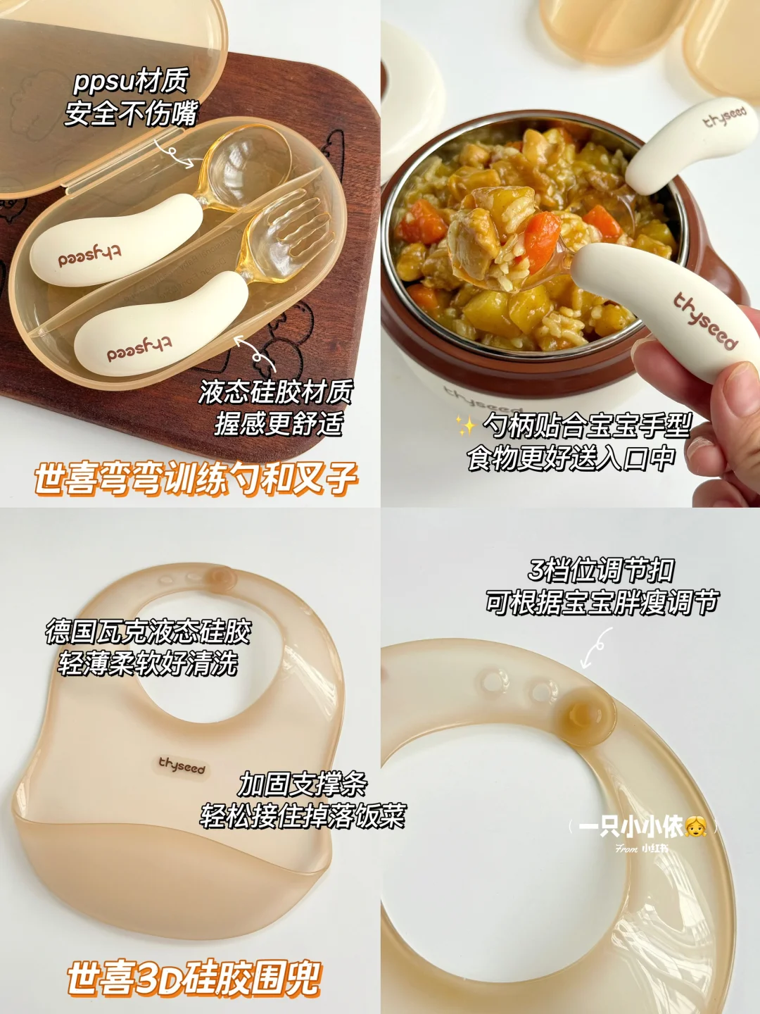 🙋我还一起入了世喜家的训练勺和围兜,配齐了“炫饭3️⃣件套”!训练勺自重很轻🍴手柄结合宝宝手型,很好抓握,自主进食期的宝宝用它更顺手👏围兜轻薄又能“装”,稳稳接住掉落的食物🥦和奶嘴一样的液态硅胶材质,用起来更安心!三个档位随意调节,戴起来不会勒住宝宝脖子![大笑R]