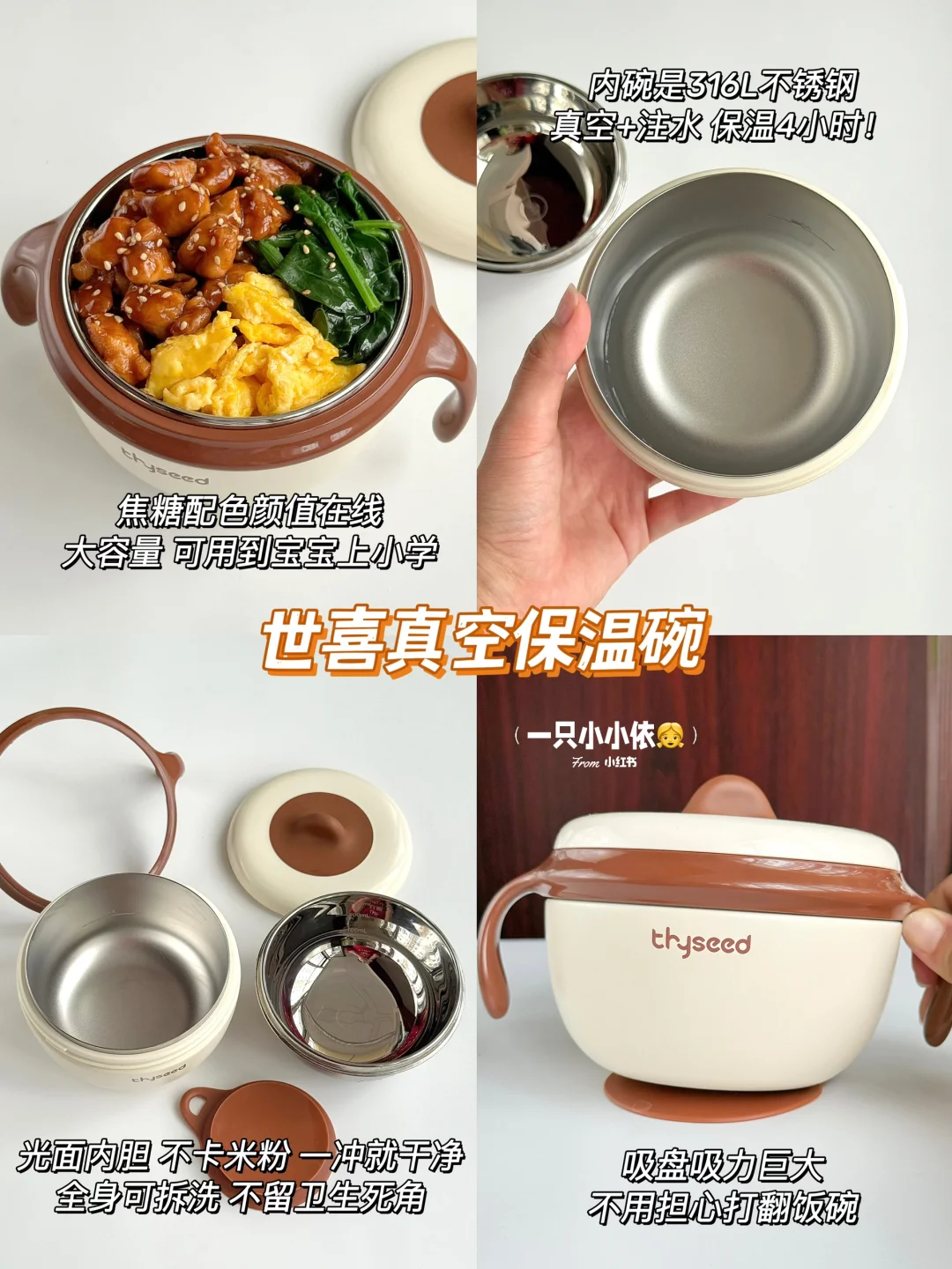 一场秋雨一场凉☔️5g入冬的速度,一不小心就会让娃的饭饭变凉,赶紧给女鹅换上了世喜真空保温碗,一体式真空锁温设计嘎嘎贴心,只需要在外碗倒入热水,就能保温4️⃣小时~不担心宝宝吃凉的胃口不舒服啦!内碗是316L不锈钢的材质,安全耐用好清洗[赞R]光面内胆设计,不卡米粉和辅食,一冲就干净,使用频率嘎嘎高✨碗底的吸盘吸力巨大,大力士宝宝也打不翻!而且它还可以一碗多用,内碗可以盛饭、蒸鸡蛋、喝汤,外碗可以装水果🫐容量大,用到上小学也没问题!