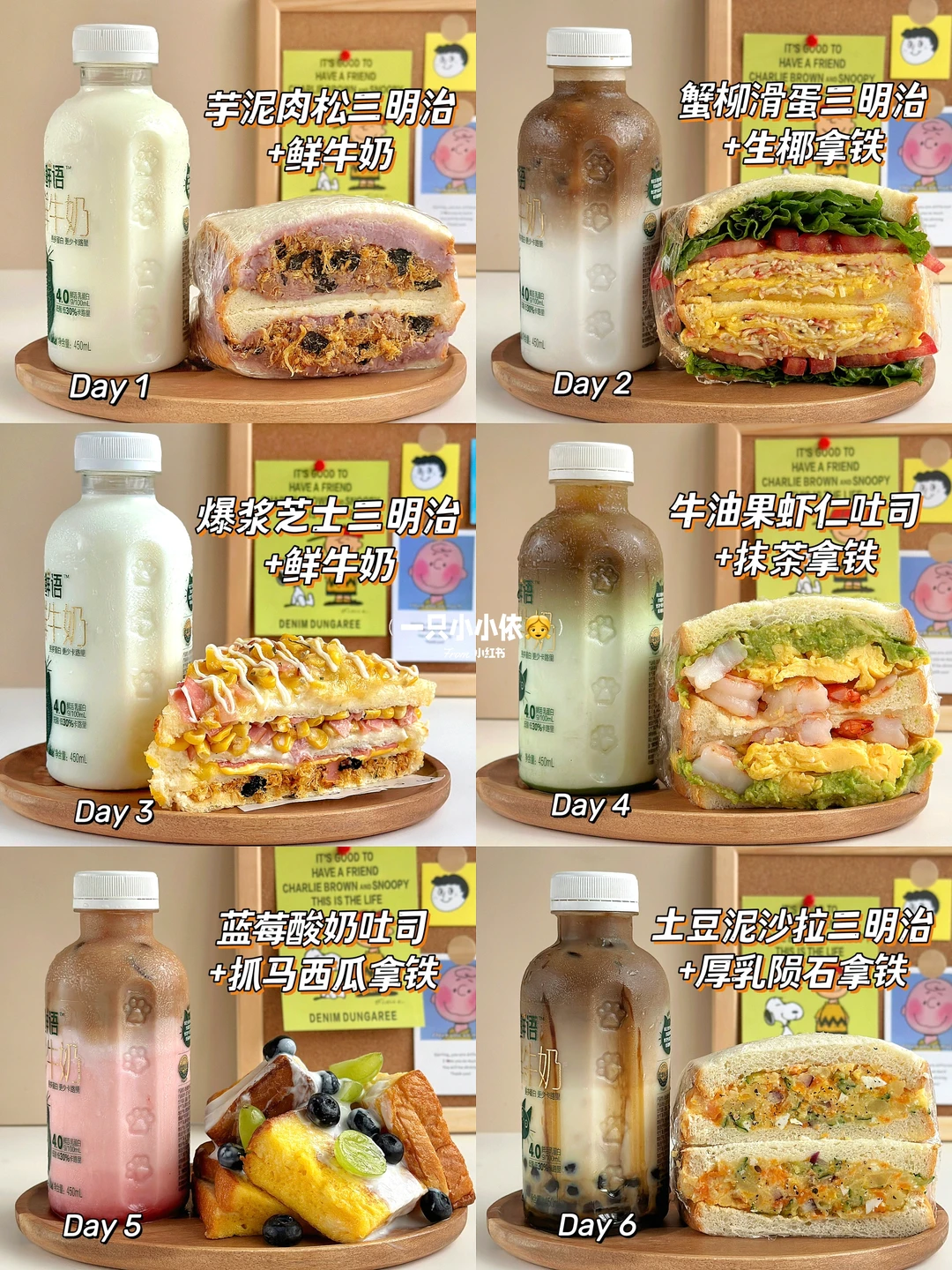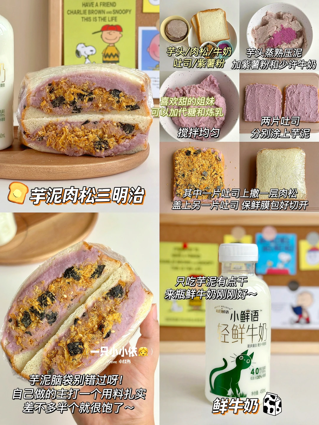 DAY 1:芋泥肉松三明治+鲜牛奶