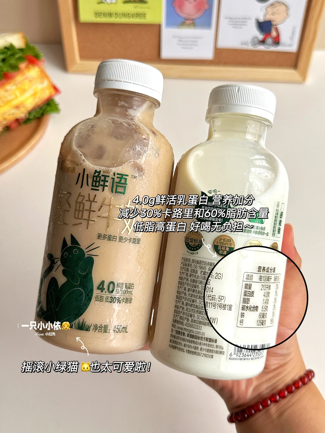 每日鲜语瓶子上的摇滚小绿猫和侧面猫爪🐱简直萌翻了!叫它小绿猫鲜奶也不为过!!瓶身容量很足,可以直接用来自制拿铁,方便Shake Shake🧋轻鲜拿铁工作日带到公司也很方便哦!咖啡脑袋们快安排上小鲜语吧