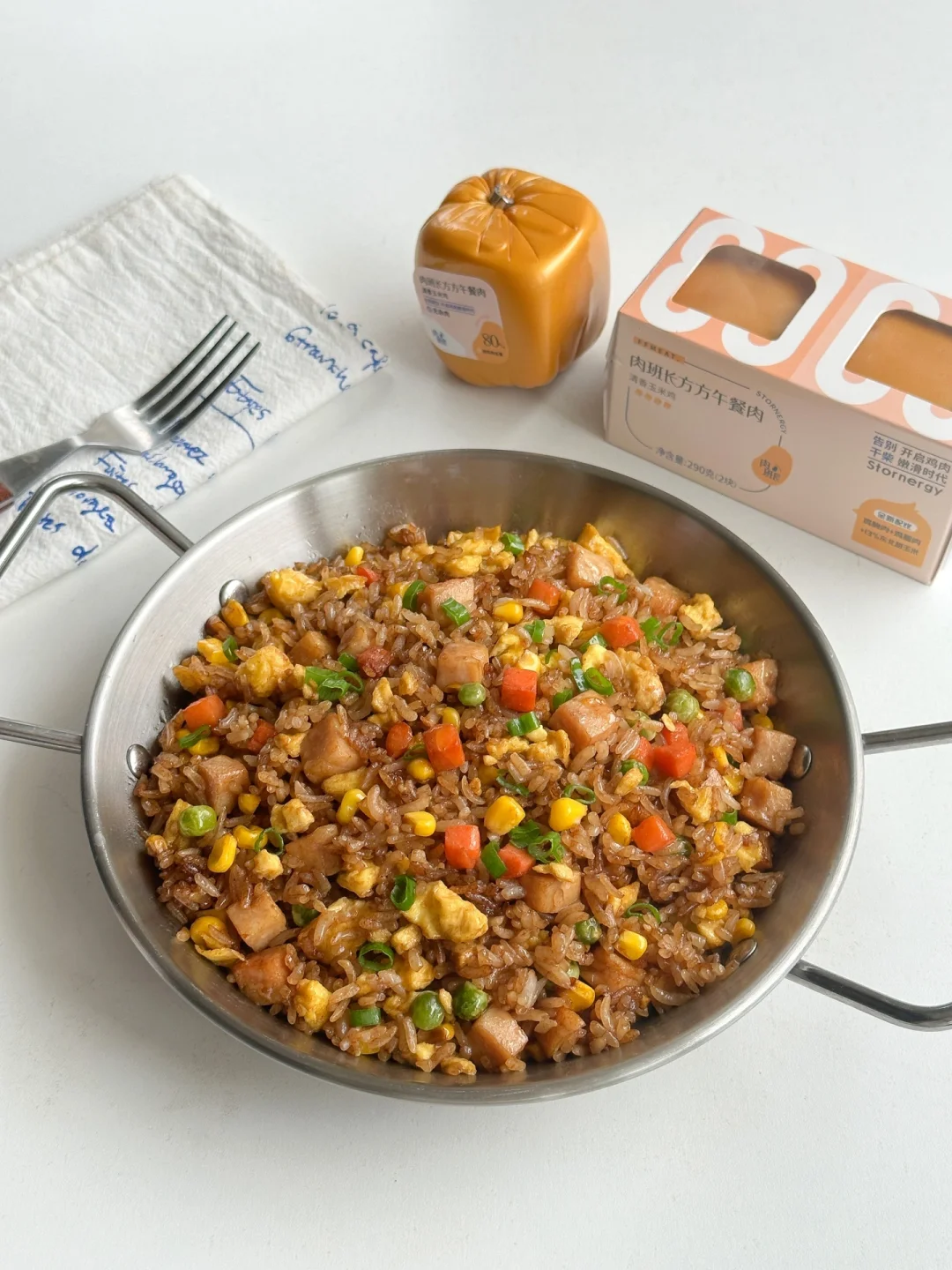 炒饭中我用的是肉班长方方午餐肉~嫩滑原味鸡的也太嫩了吧!87%纯鸡肉,没有淀粉,一口下去那叫一个Q弹滑嫩!配料干净,给闺女吃也放心~平时时间紧张煎几片,分分钟搞定营养一餐!