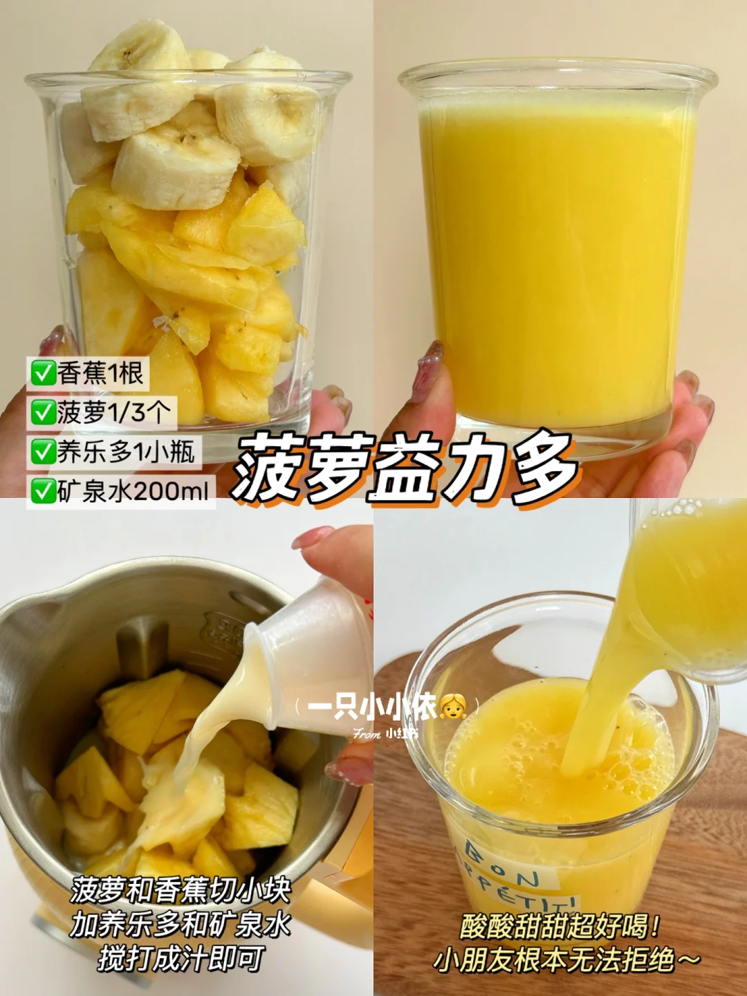 ➡️ 蔬菜和水果清洗干净,切成小块,加适量过滤后的矿物质水/牛奶/养乐多搅打细腻即可