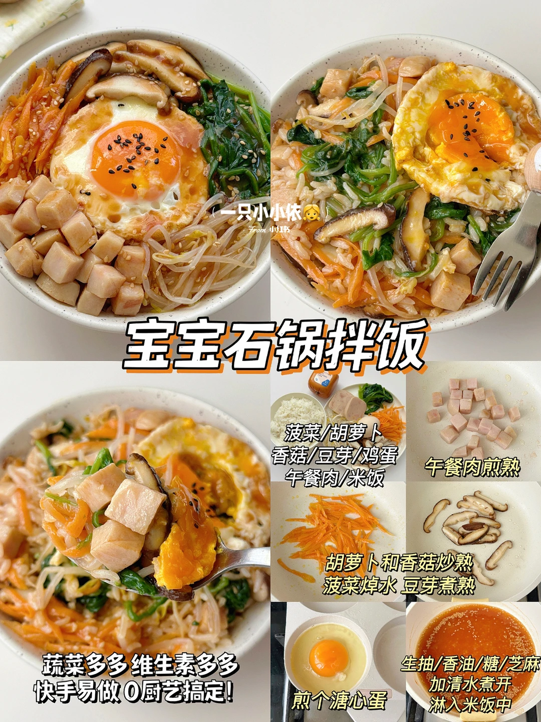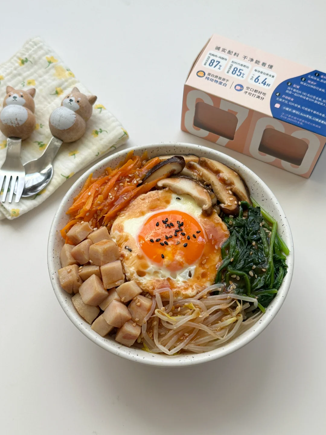 🔹做法:午餐肉煎熟,胡萝卜和香菇炒熟,菠菜焯水、豆芽煮熟,煎个溏心蛋;生抽+香油+糖+芝麻,加清水煮开;配菜码在米饭上,淋入料汁拌匀✅