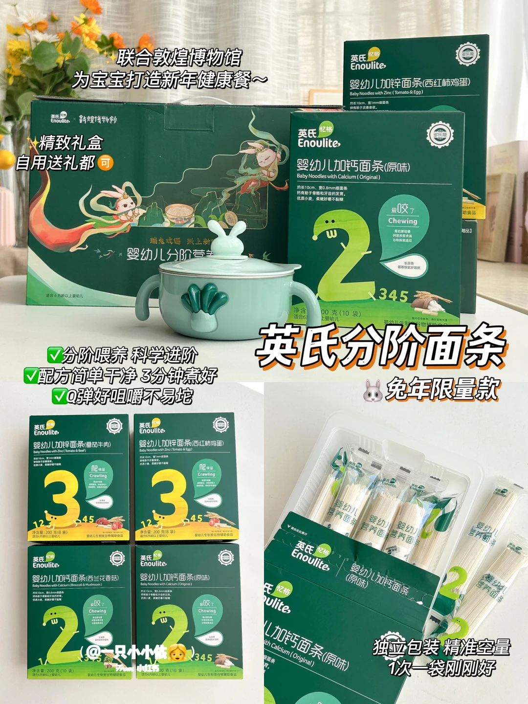 🐰瑞兔呈祥,新岁喜乐!为了给宝宝更多新春仪式感,我特意入了英氏分阶面条兔年限量款👏🏻它是与敦煌博物馆联名的,礼盒画风充满了艺术感,还送了兔子造型的可爱餐具[哇R]