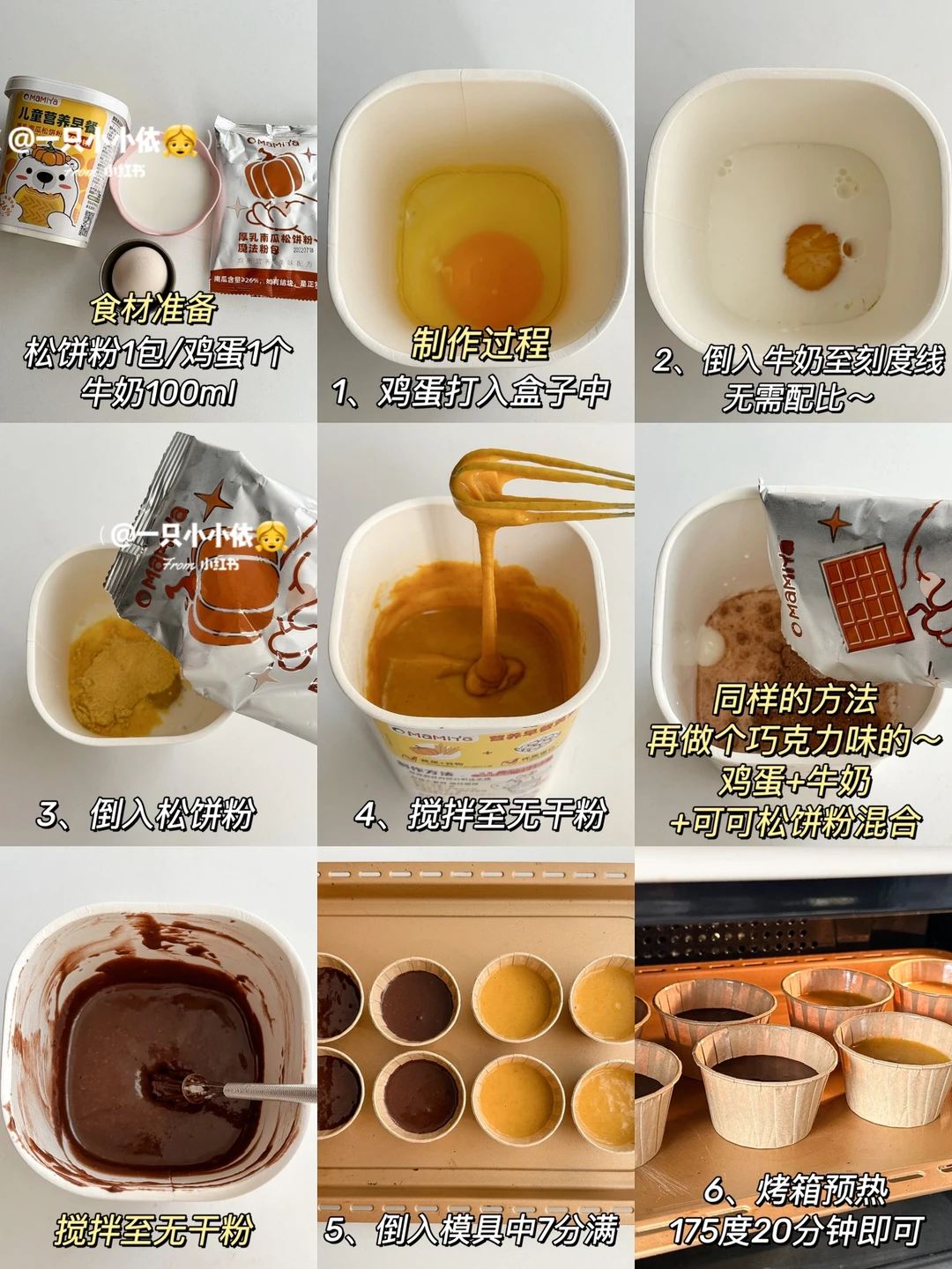 👉鸡蛋磕入盒子中,倒入100ml牛奶+ Mamiya蛋糕粉,搅拌至无干粉,倒入杯子模具中(7分满);烤箱预热后,175度20分钟✅