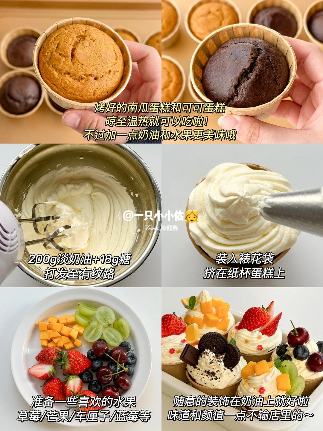 👉200ml淡奶油+18g糖打发至有纹路,装入裱花袋;蛋糕晾凉后挤入奶油,摆上一些自己喜欢的水果装饰即可(草莓/蓝莓/芒果/提子等)✅