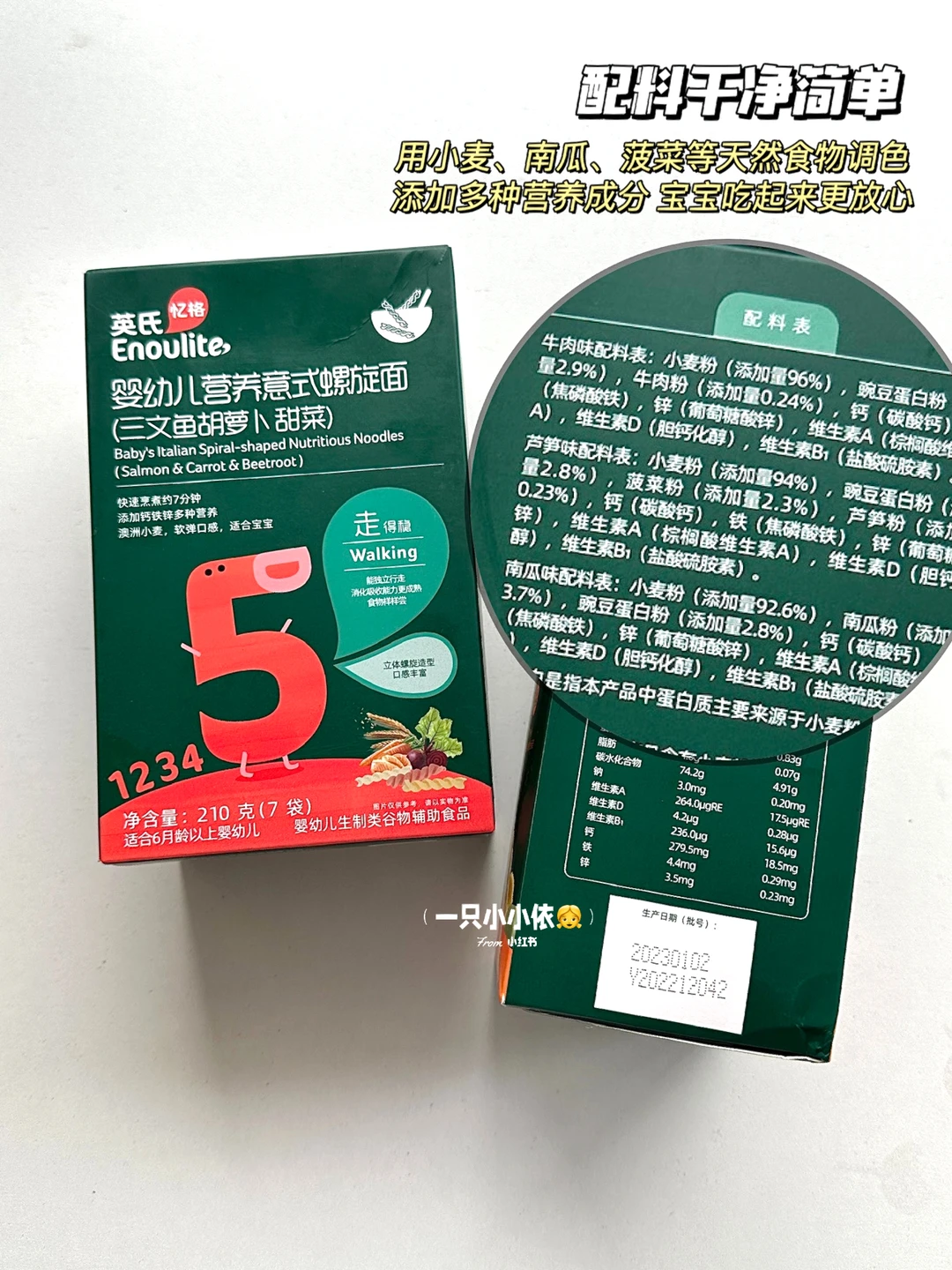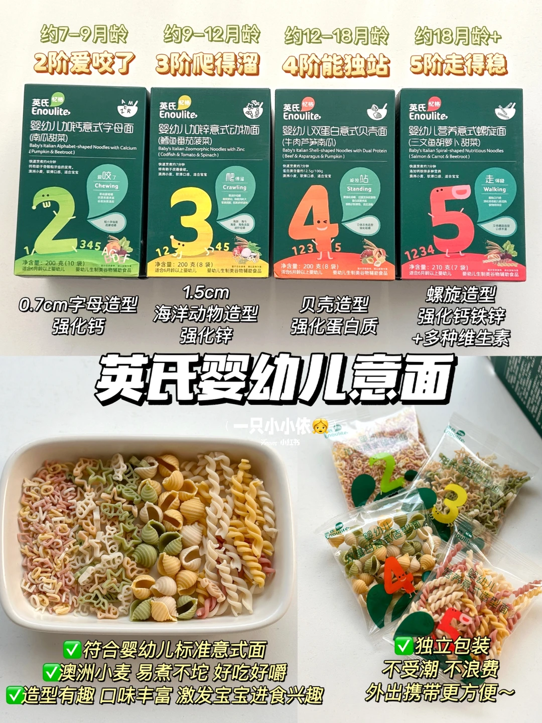 这次用到的意面是符合婴幼儿标准的英氏婴幼儿意面✨就像教育要因材施教一样,辅食添加同样要遵循分阶喂养原则,根据宝宝月龄和发育体征,逐步添加更适合宝宝的食物👏🏻英氏在这方面可以说是得心应手,从米粉到面条、意面都是分阶设计的,新手爸妈只要跟着数字选就不会错😎
