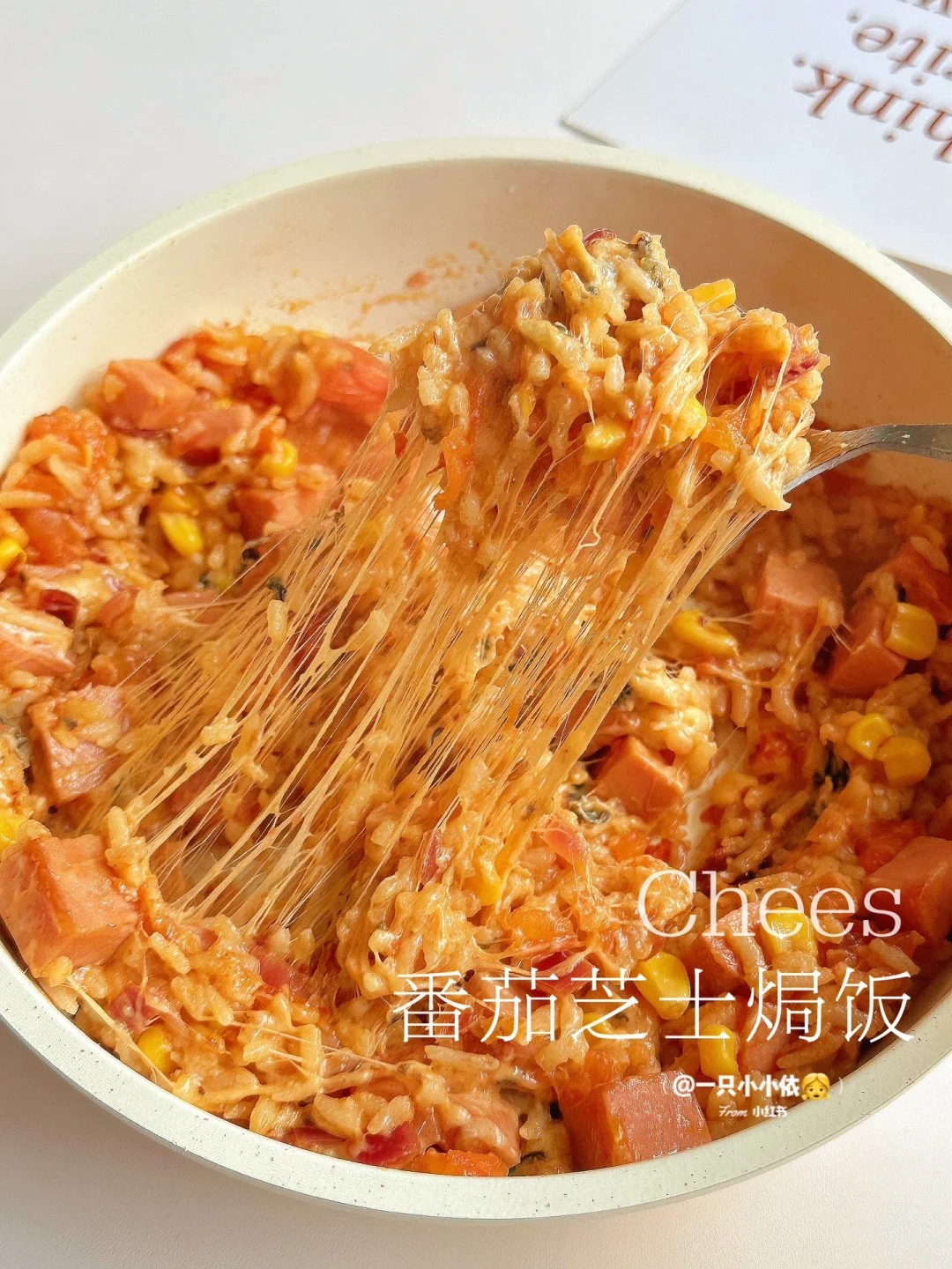 想告诉全世界芝士控姐妹,超长拉丝的番茄芝士焗饭一定要试试!无需烤箱,一口平底锅就搞定~