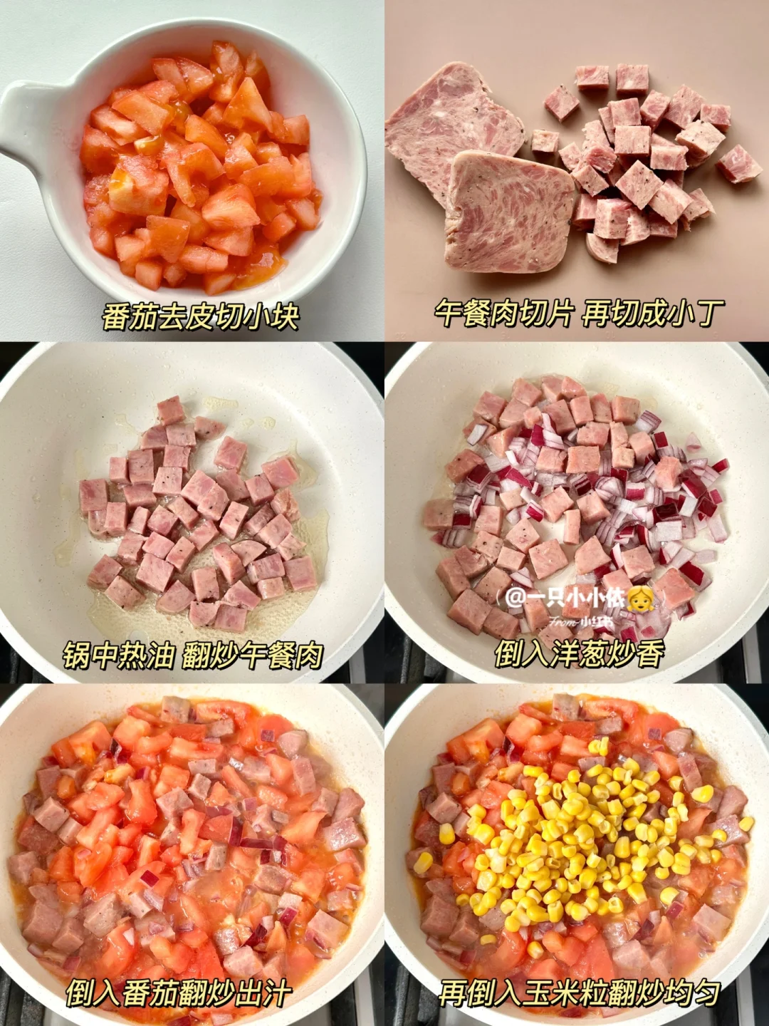 2⃣️锅中热油,翻炒午餐肉,倒入洋葱炒香;倒入番茄翻炒出汁,再倒入玉米翻炒均匀;