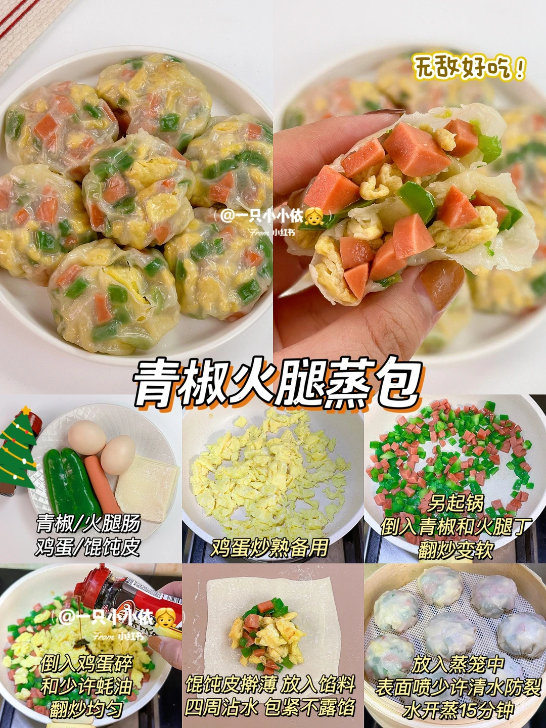 👉食材:青椒/火腿肠/鸡蛋/馄饨皮