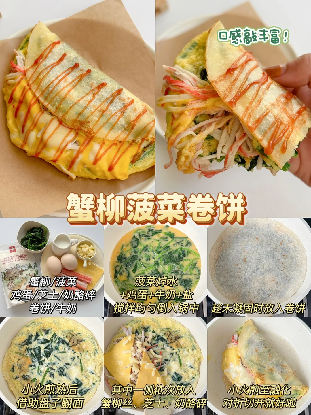 ✨食材:蟹柳/菠菜/鸡蛋/芝士/奶酪碎/ 卷饼/牛奶