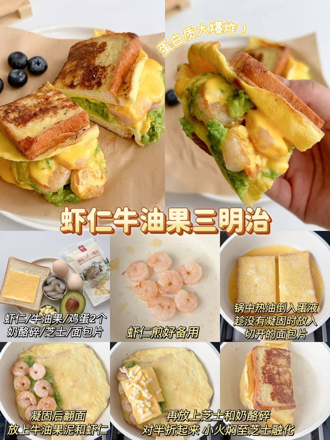 ✨食材:虾仁/牛油果/鸡蛋/奶酪碎/芝士/面包片