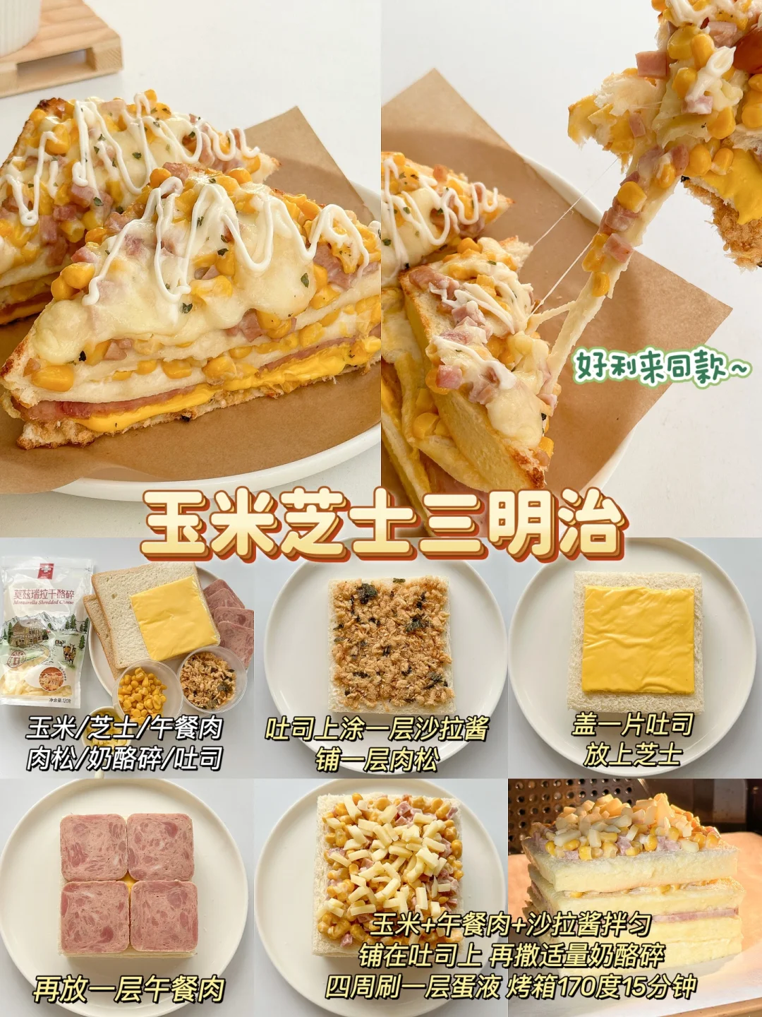 ✨食材:玉米/芝士/午餐肉/肉松/奶酪碎/吐司