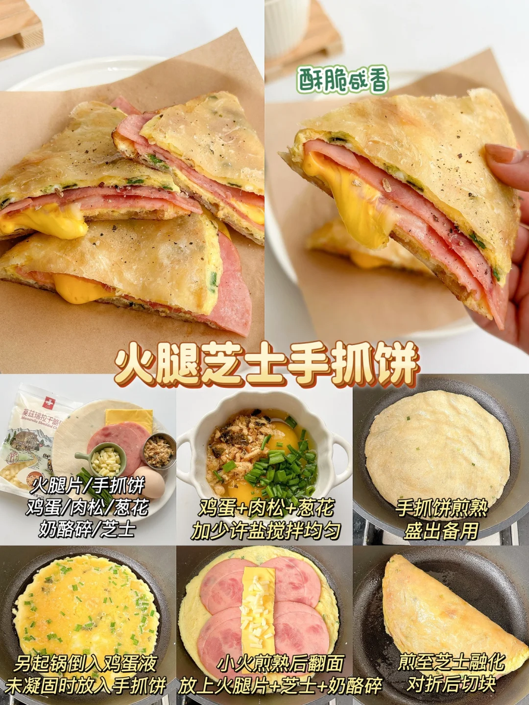 ✨食材:火腿片/手抓饼/鸡蛋/肉松/葱花/奶酪碎/芝士