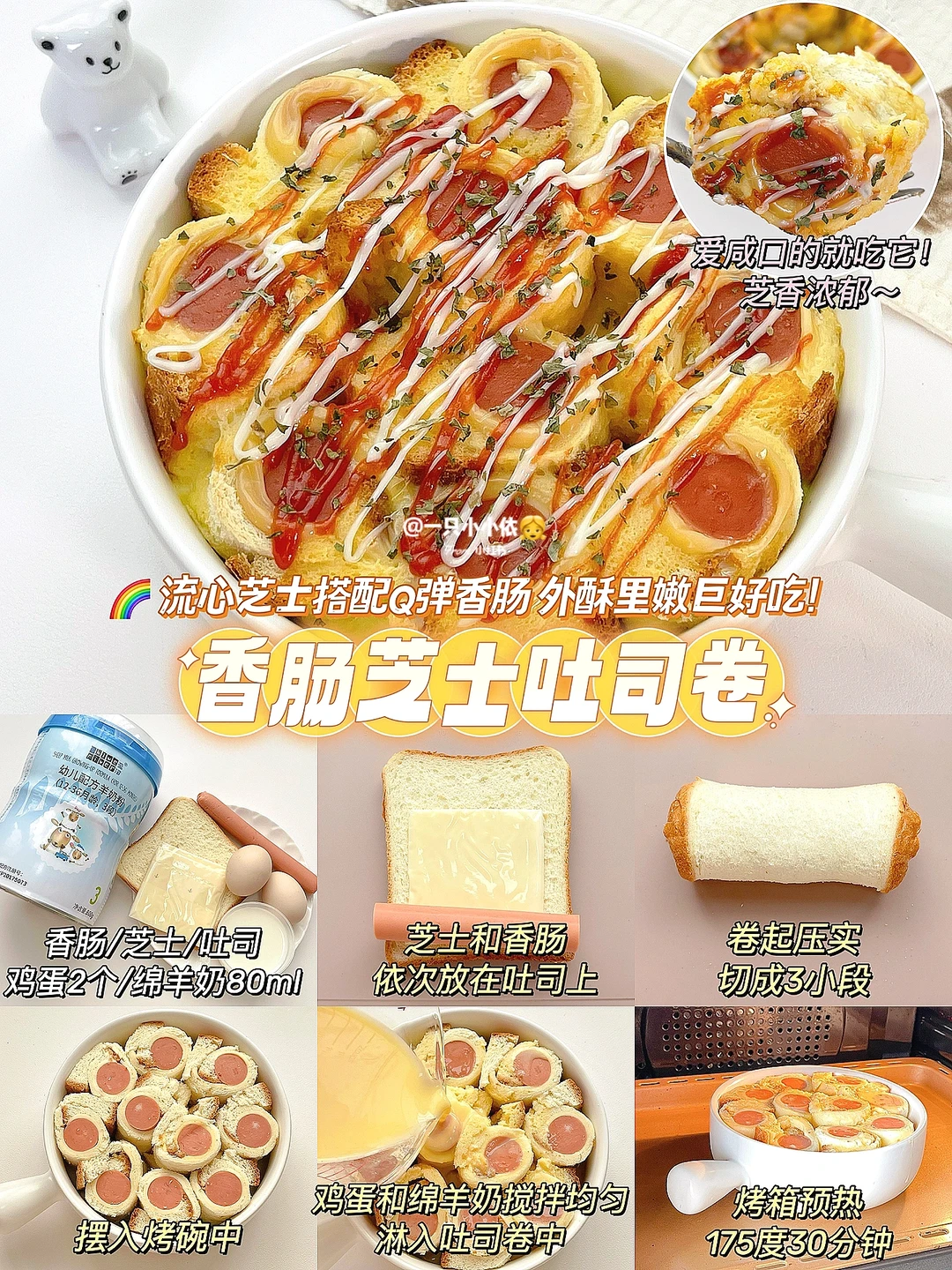 👉食材:香肠/芝士/吐司/鸡蛋2个/泡好的绵羊奶80ml