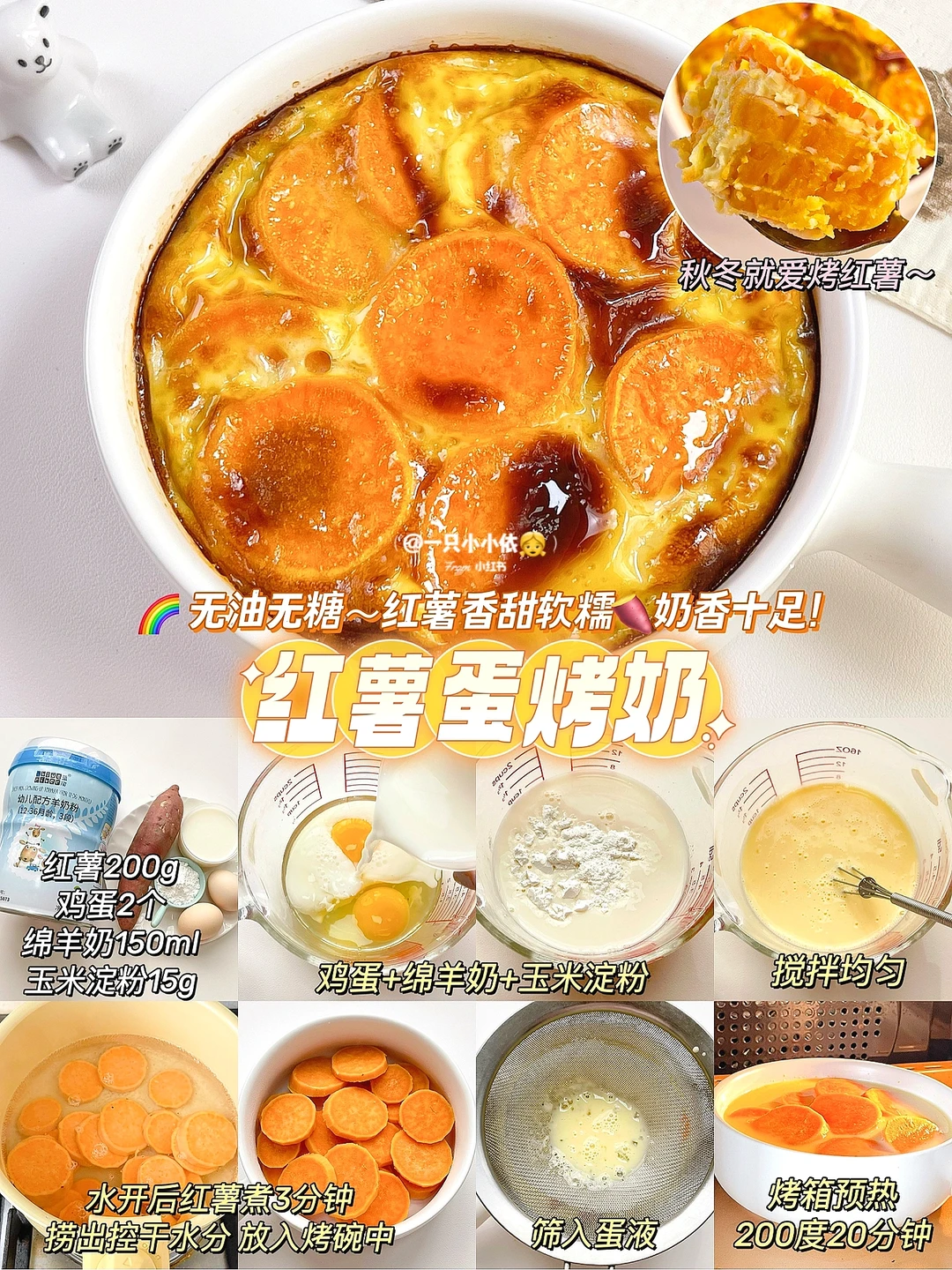 👉食材:红薯200g/鸡蛋2个/泡好的绵羊奶150ml/玉米淀粉15g