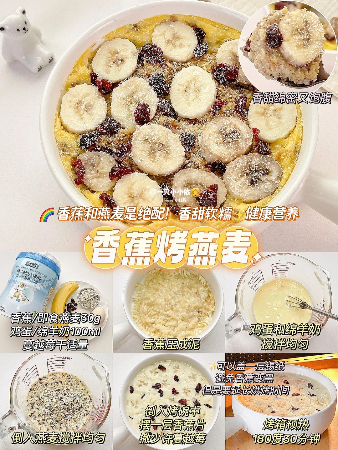 👉食材:香蕉/即食燕麦30g/鸡蛋/泡好的绵羊奶100ml/蔓越莓干
