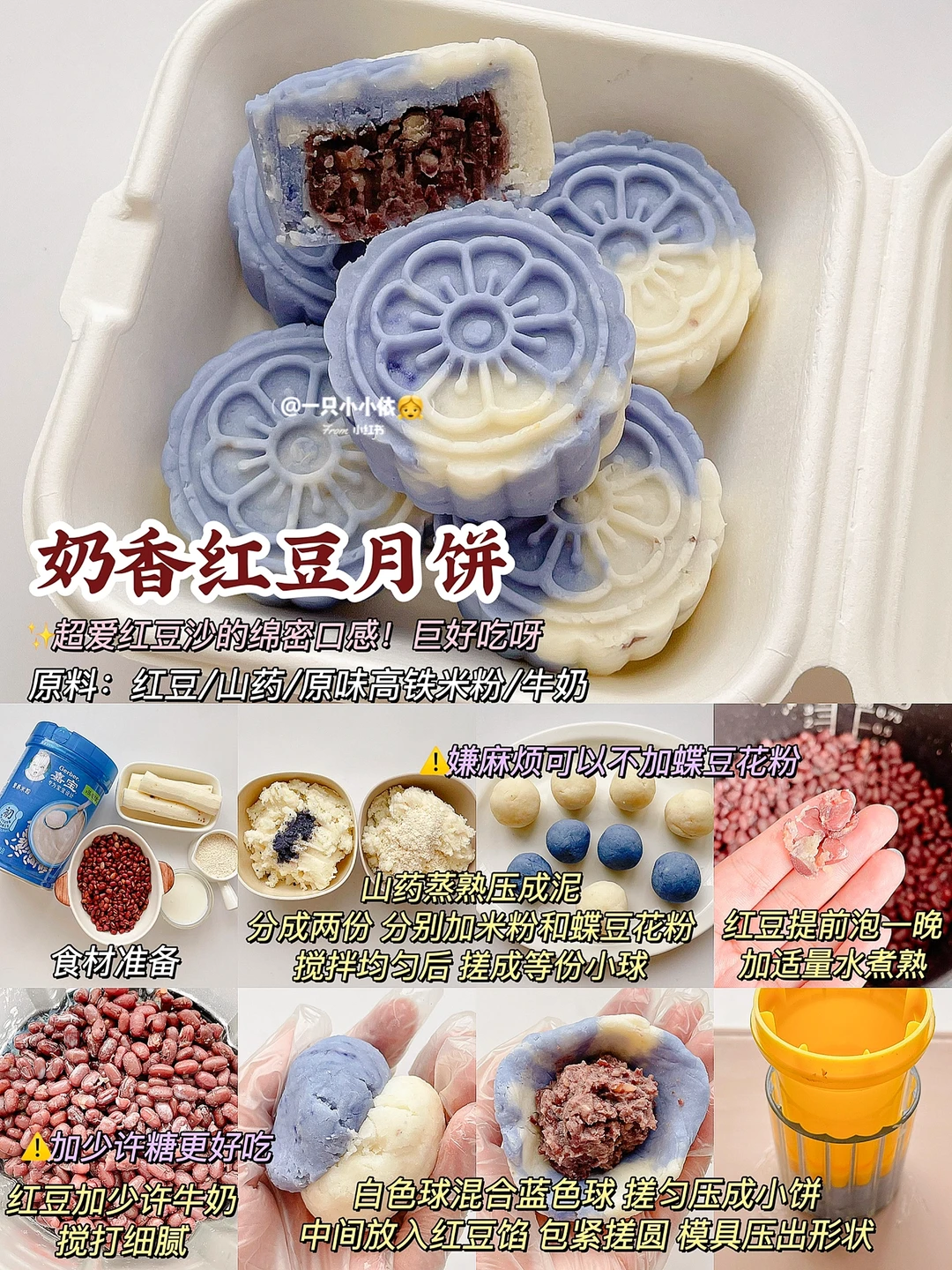 🔹做法:山药蒸熟压成泥,分成两份,分别加米粉和蝶豆花粉,搅拌均匀后搓成等份小球;红豆提前泡一晚,加适量水煮熟,加少许牛奶搅打细腻;白色球混合蓝色球,搓成小饼放入红豆馅后包紧,模具压出形状;