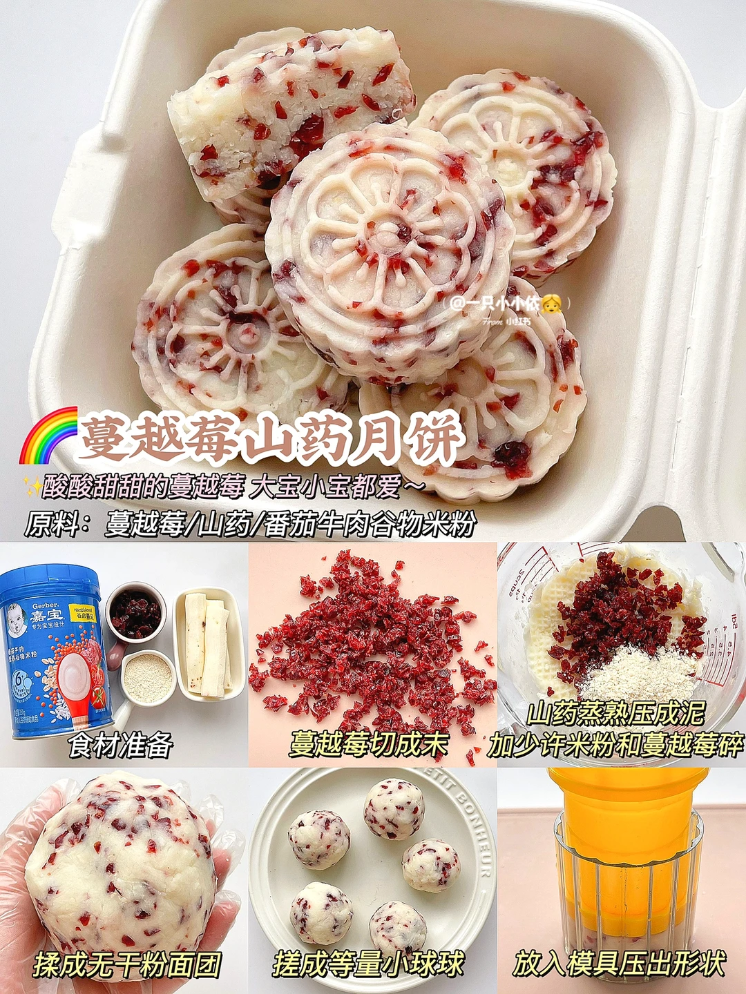 🔹做法:蔓越莓切成末,山药蒸熟压成泥,加少许米粉和蔓越莓碎,揉成无干粉面团,搓成等量小球球,放入模具压出形状;