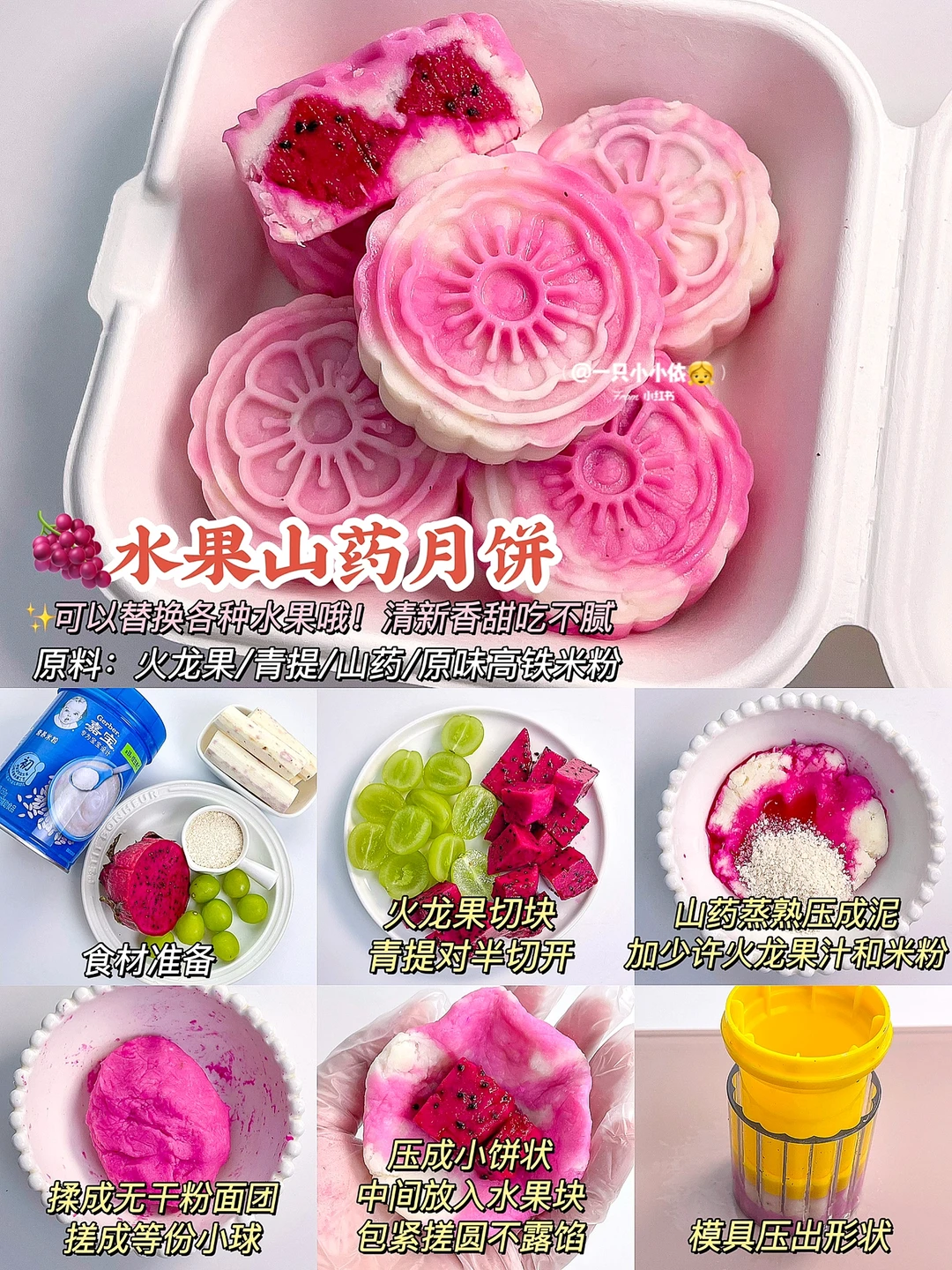 🔹做法:火龙果切块,青提对半切开;山药蒸熟压成泥,加少许火龙果汁和米粉,揉成面团,搓成等量小球,压成小饼,中间放入水果块,包紧搓圆,模具压出形状;