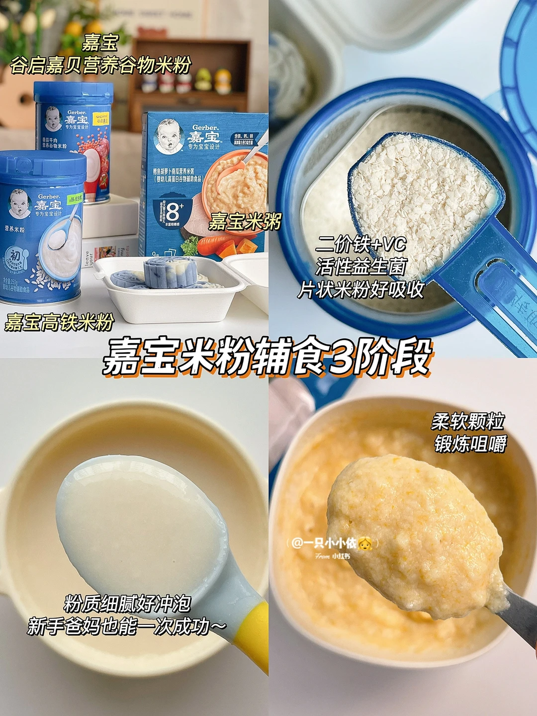 3⃣️第三口-嘉宝米粥:米粥的小颗粒软硬适中,帮助宝宝锻炼咀嚼能力,高铁高钙高蛋白,营养也hin丰富呢!
