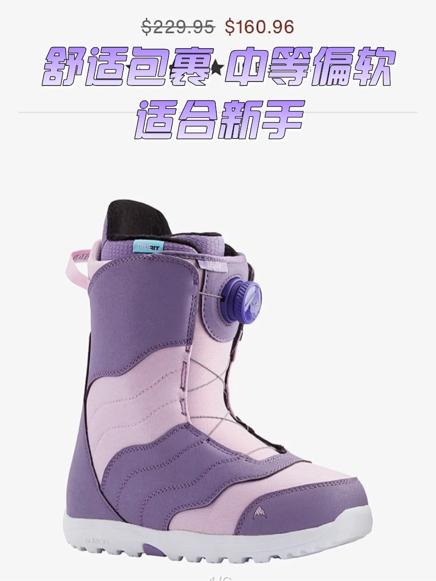 雪鞋最好买一个BOA 的,方便快捷很多。分享的两款都是单BOA,还有双BOA的,包裹性更强~除此之外还要看硬度,新手适合3-5度,中级回转阶段6-7度,立刃刻滑阶段7-8度