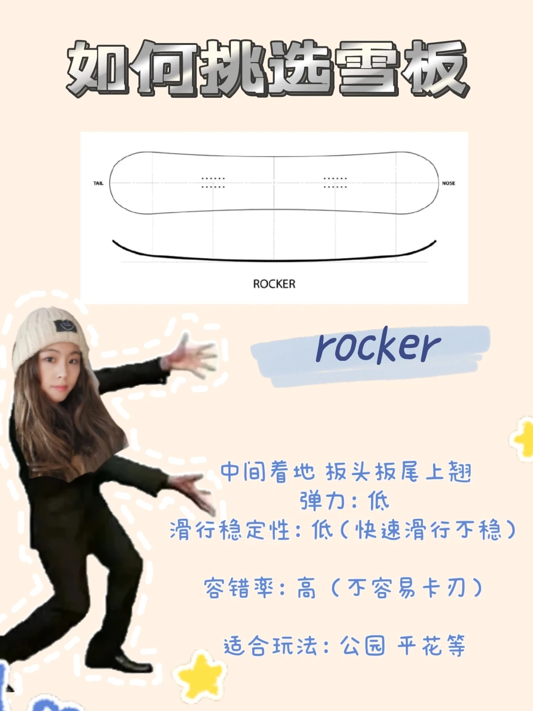 2⃣rocker:板头尾向上翘,容错率较高,但是快速滑行不稳,弹力也较低