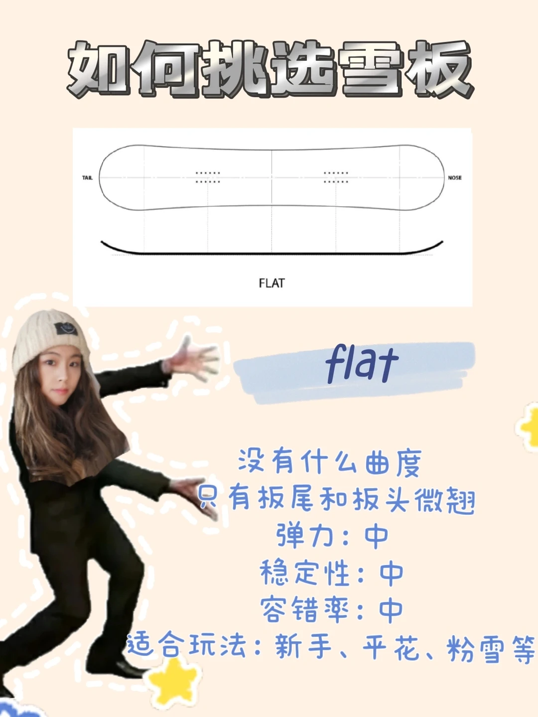 3⃣flat:一块大平板,只有板头尾微翘,在camber和rocker之间,比较平庸,相对不卡刃
