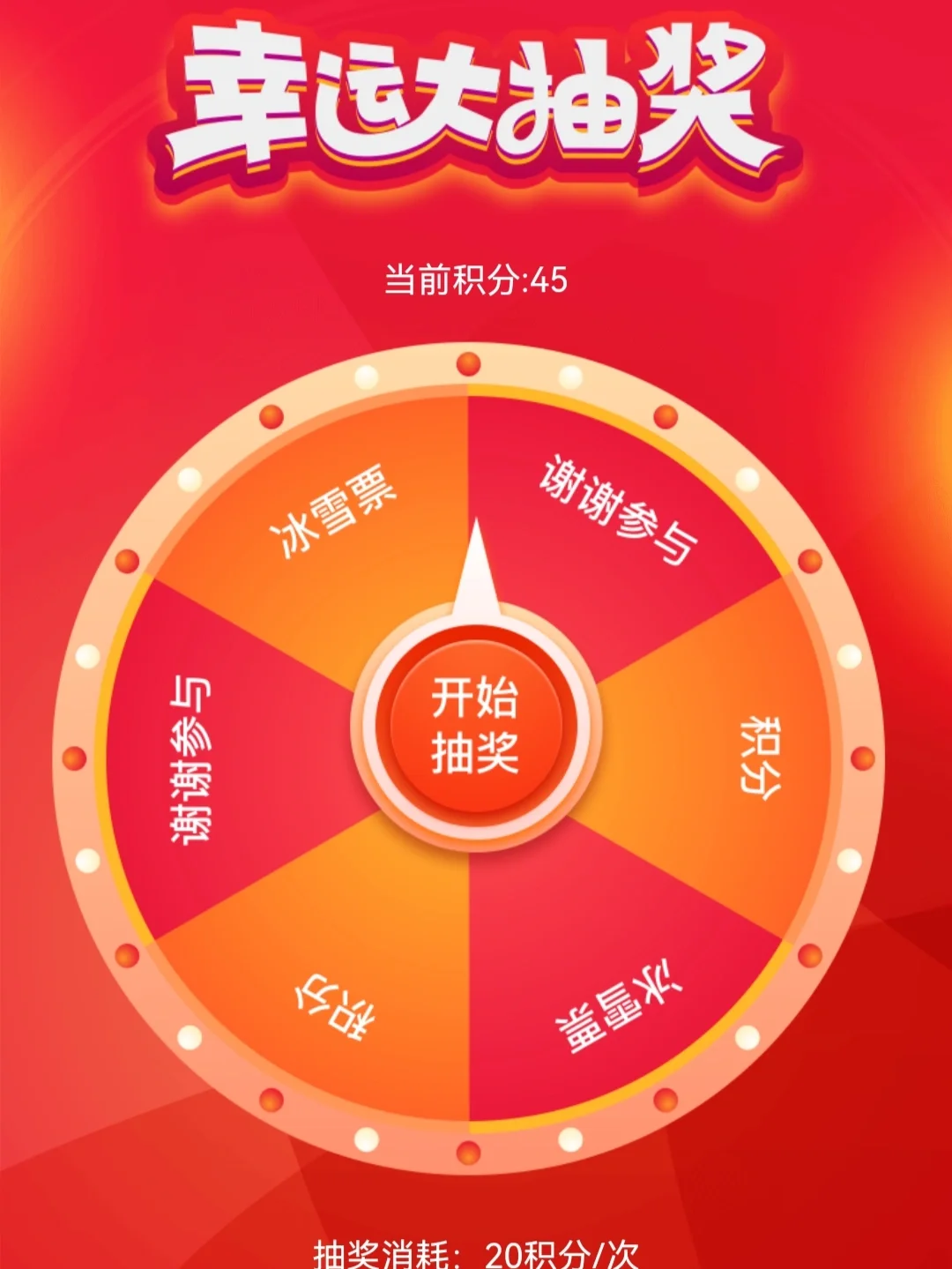 4⃣“积分抽奖”每次消耗20积分,但基本每次都能获得30积分,净赚10分,每日抽5次,就可以有50积分~基本两天就可以到手雪票