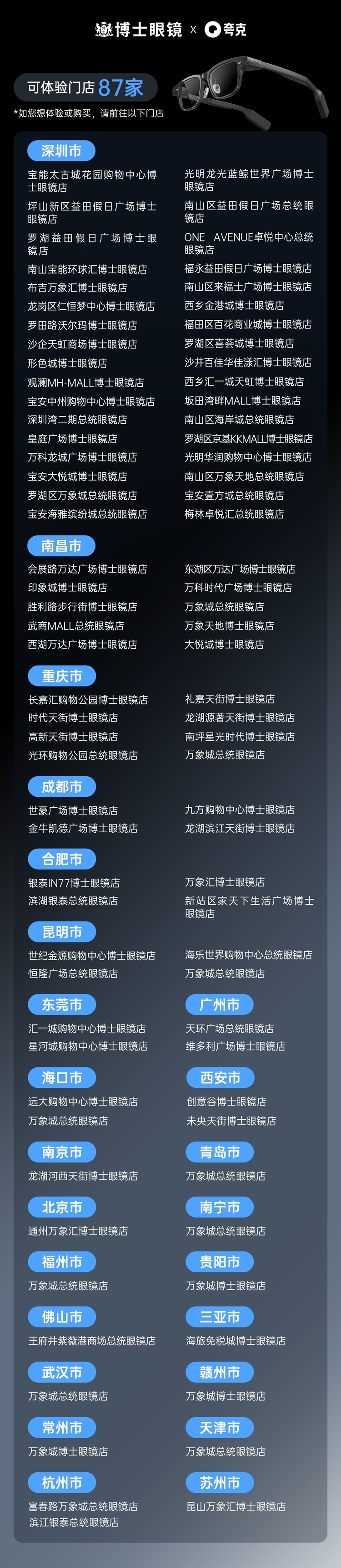 即日起,前往以下博士眼镜门店(详见下图)即可体验和购买夸克AI眼镜S1,并且在门店购买夸克AI眼镜S1的用户可享受专业的验光与配镜服务。博士眼镜将依托其严谨的验配流程与服务经验,确保每一位用户都能获得清晰、舒适且与智能眼镜形态完美契合视觉解决方案。