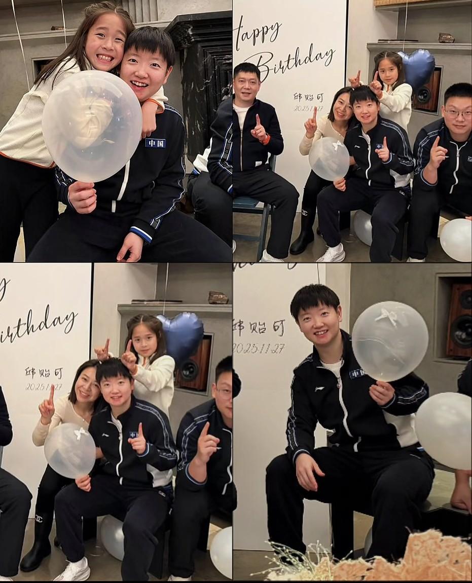 孙颖莎陪邱指过生日啦! 手里拿着小气球拍照 小豌豆还抱着莎莎姐姐合照,师娘也好漂亮呀,邱指可太开心了。 看起来真的像是一家人一样的,不知道还以为是全家福呢。 记得以前口罩时期,孙颖莎在成都封训,为了孙颖莎的健康着想,师娘每天接送上下训,还包揽了孙颖莎的衣食住行,孙颖莎才没有生病,真的是把她保护得很好。 师娘和小豌豆还会去比赛现场,给孙颖莎加油,真的不是一家人胜似一家人。 孙颖莎回成都真的跟回家一样了。 图片源于网络
