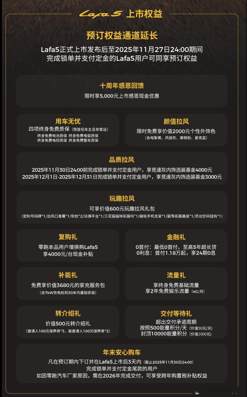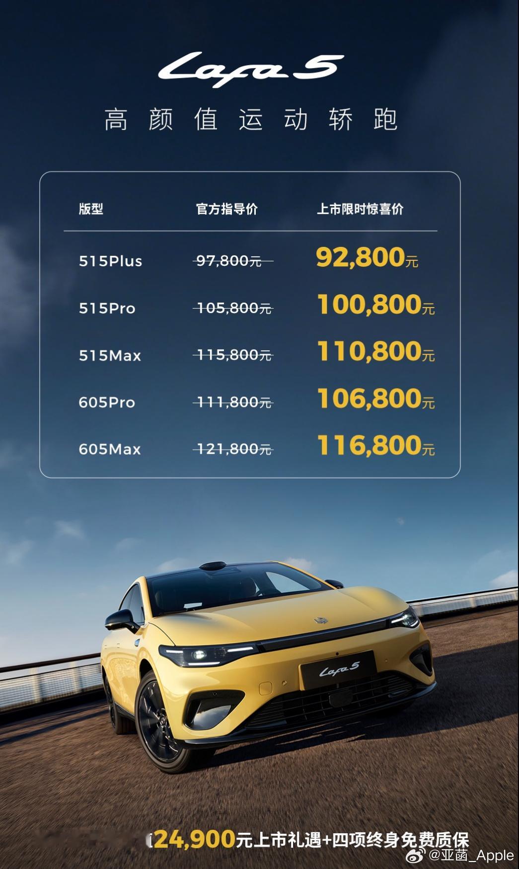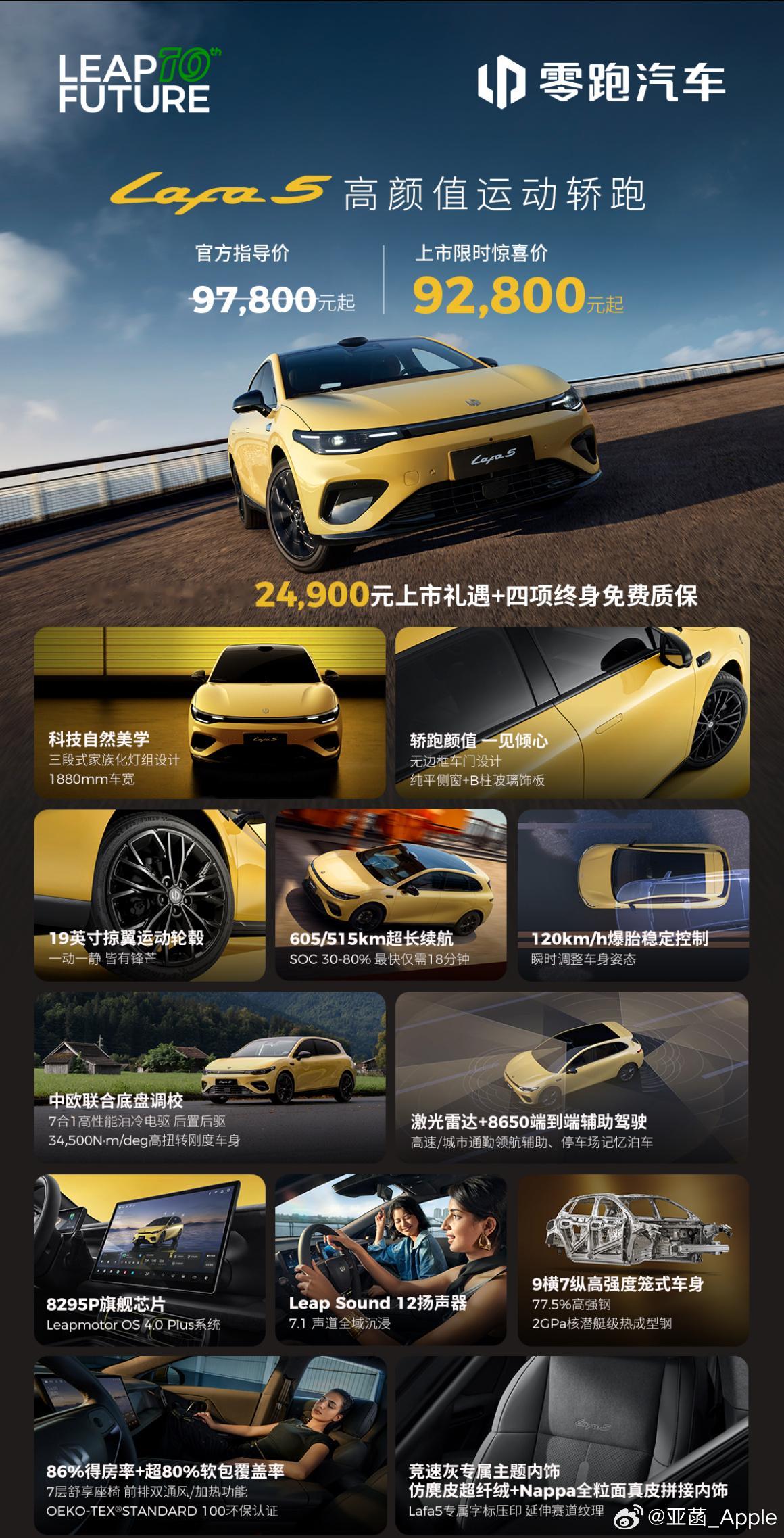 10万级纯电轿跑卷王来了!零跑Lafa5上市限时9.28万起95后悦己青年狂喜!605km超长续航+18min快充,通勤出游无焦虑;高通8295P芯片+双AI大模型,语音控车、可见即可说超丝滑,激光雷达辅助驾驶新手也稳;无边框车门+19英寸运动轮毂,6款个性配色颜值拉满,0.256超低风阻又美又能打86%得房率+超80%软包覆盖,轿跑空间也通透;后置后驱6.4秒破百,中欧联合调校兼顾操控与舒适。现在下定至高享2.49万权益,终身质保、免费家充包全安排,2025年12月31日前锁单还能冲跨年购置税补贴中国新势力出口冠军的诚意之作,10万预算拿下20万级配置,这波真的可冲零跑Lafa5开启轿跑10万级时代年轻人首选Lafa5限时9.28万起
