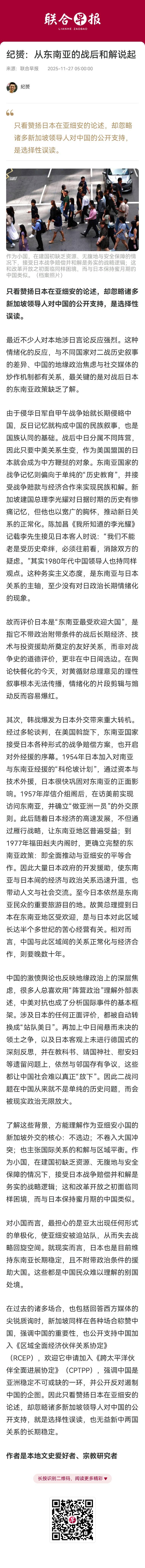 新加坡学者为黄循财冒犯中国言论辩解,模糊了焦点! 新加坡总理黄循财对中日关系发表不当言论,引起中国学者和网民的批评。新加坡学者纪赟在《联合早报》发文为黄循财辩解,他一开始花了很大篇幅讲新加坡及东南亚与日本是怎么和解的,这与中国人批评黄循财的言论无关,因为中国并没有反对和批判东南亚与日本的和解。 东南亚与日本和解是他们之间的关系,也是中国无关。中国与东南亚不同,中日关系与日本和东南亚关系也不同,日本对待东南亚和对待中国的态度也不同。所以,东南亚与日本和解,得不出中国可以与日本和解,更不能把中日不能和解的原因咎种于中国。 他指责中国人对黄循财言论是“选择性误读”,但却回避讨论黄循财最近对中日关系的言论,可能他自己也觉得黄循财的言论不妥吧。 新加坡领导人在其它问题,其它场合称赞中国,不能证明黄循财对中日争议发表的言论就是中方可以接受的。 黄循财在称赞东南亚与日本和解的同时,称中国没能与日本和解,希望中国走出历史阴影,懂中文的人都知道,他实际上是把中日不能和解,不能走出历史阴影的责任归于中方。这是错误的,完全不符合事实的。 其次,针对最近的中日争端,黄循财回避评论高市早苗的错误言论,却说日本已经做出了解决问题的姿态,希望中方也有同样的态度。这明显就是把中日矛盾责任归于中方,这完全就是不分是非,不论善恶,拉偏架了。 新加坡领导人可以不对中日争端发表评论,也可以模糊地说希望两国解决矛盾,但不分是非,拉偏架,是中国人无法接受的。 中国学者、媒体和网民对黄循财最近对中日关系不当言论的批评,并没有完全否定新加坡,也没有否定新加坡在其它问题上对中国的友好态度。实事求是,一码归一码。 黄循财可以从新加坡的立场和利益发表言论,中国人也有权批判损害中方利益和尊严的言论。中国舆论就事论事的批评,哪来“选择性误读”?