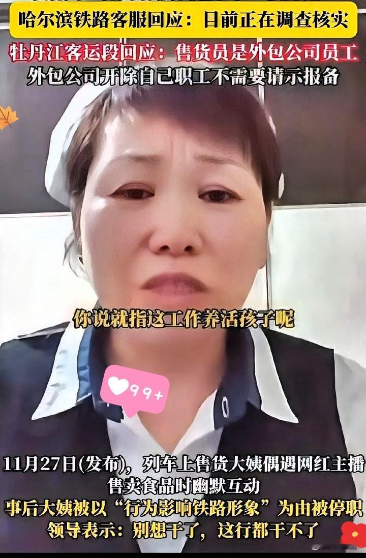领导想整底层员工有多容易[流泪] 东北列车员大姐火了的事儿,谁看了不气?没骂街没甩脸,跟网红互动得又热情又接地气,明明是给列车、给东北旅游免费打广告,结果一通电话就被开除了。 说什么“有损铁路形象”?纯属借口!真正的原因,大概率是领导见不得底层员工发光。大姐凭真心服务圈粉,这种实打实的口碑功劳抢不走,就干脆一棍子打死,眼不见心不烦。可领导没想过,这大姐本能让列车变成打卡点,给东北旅游添把火,结果倒好,反而寒了打工人的心,还落得个“不懂变通”的骂名。 职场里最恶心的,就是这种见不得下属好的领导。员工凭本事造福利,不奖励就算了,还背后下黑手。依我说,该开除的不是认真干活的大姐,而是这格局小到骨子里的领导!大家觉得呢?