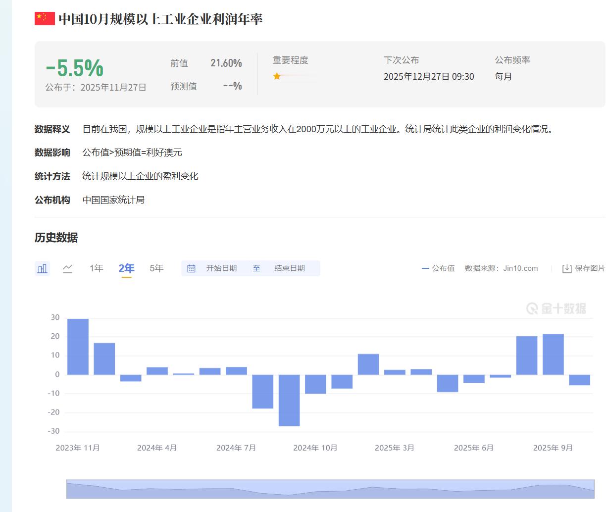 中国10月规模以上工业企业利润:1-10 月累计:全国规模以上工业企业实现利润总额59502.9 亿元,同比增长 1.9%(可比口径)10 月当月:利润同比下降 5.5%,环比下滑 27.1 个百分点,去年十月-10%的基础上。 营收情况:1-10 月营业收入 113.37 万亿元,同比增长 1.8%;10 月当月营收同比下降 3.3%利润率:1-10 月营收利润率 5.25%(同比 + 0.01 个百分点);10 月当月利润率 5.11%(同比 - 0.33 个百分点)
