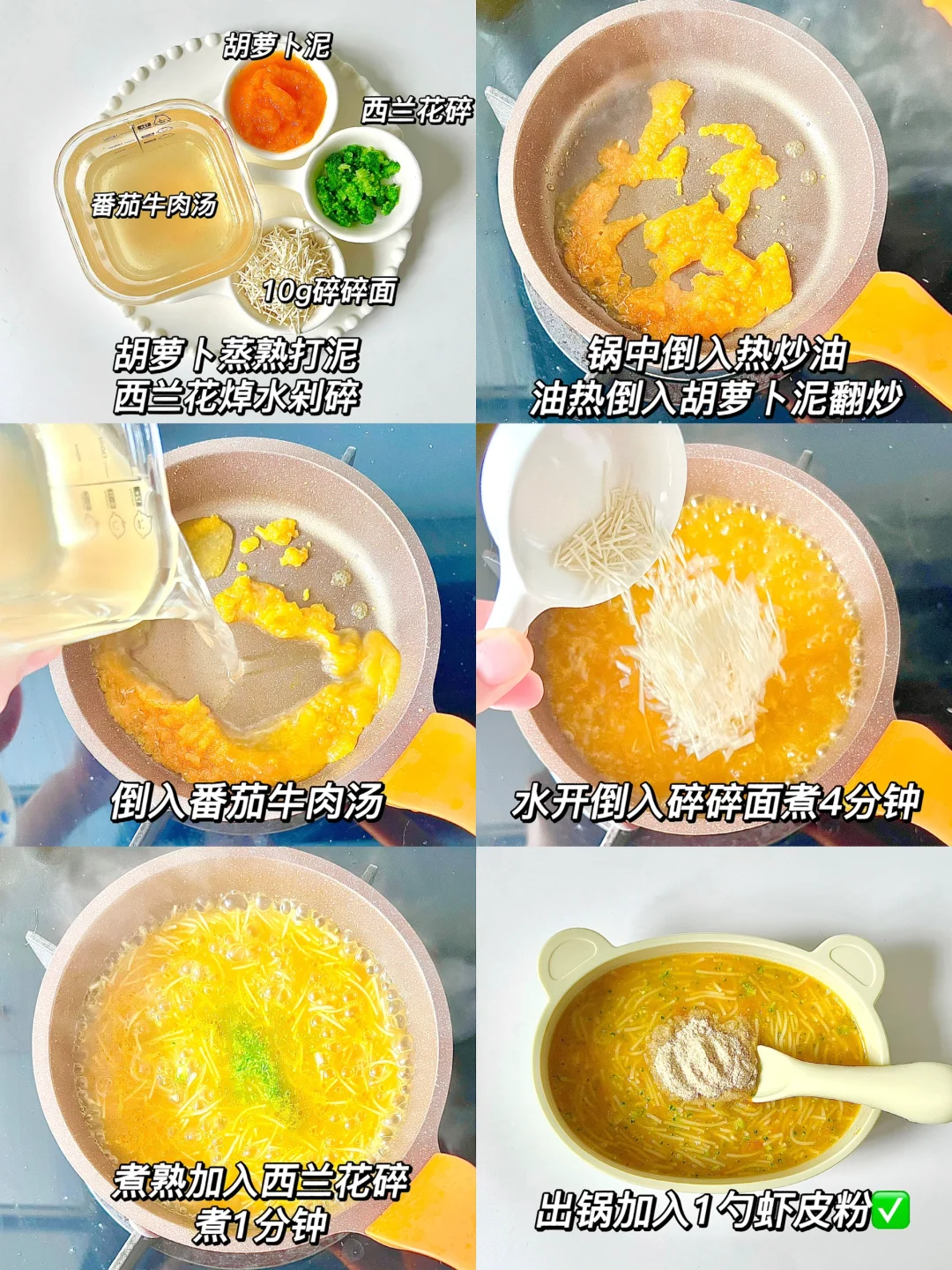 📝:碎碎面10g➕胡萝卜泥➕番茄牛肉汤➕西兰花碎