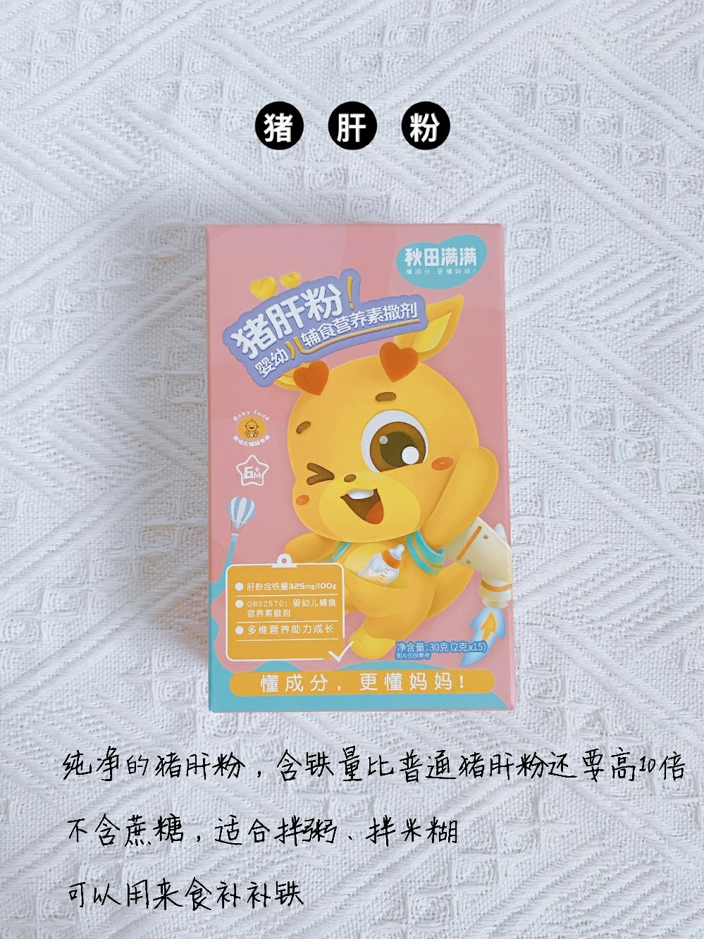 不含盐和糖,很细腻的猪肝粉,铁含量高而且不腥,平时可以拌在粥内帮助补铁。
