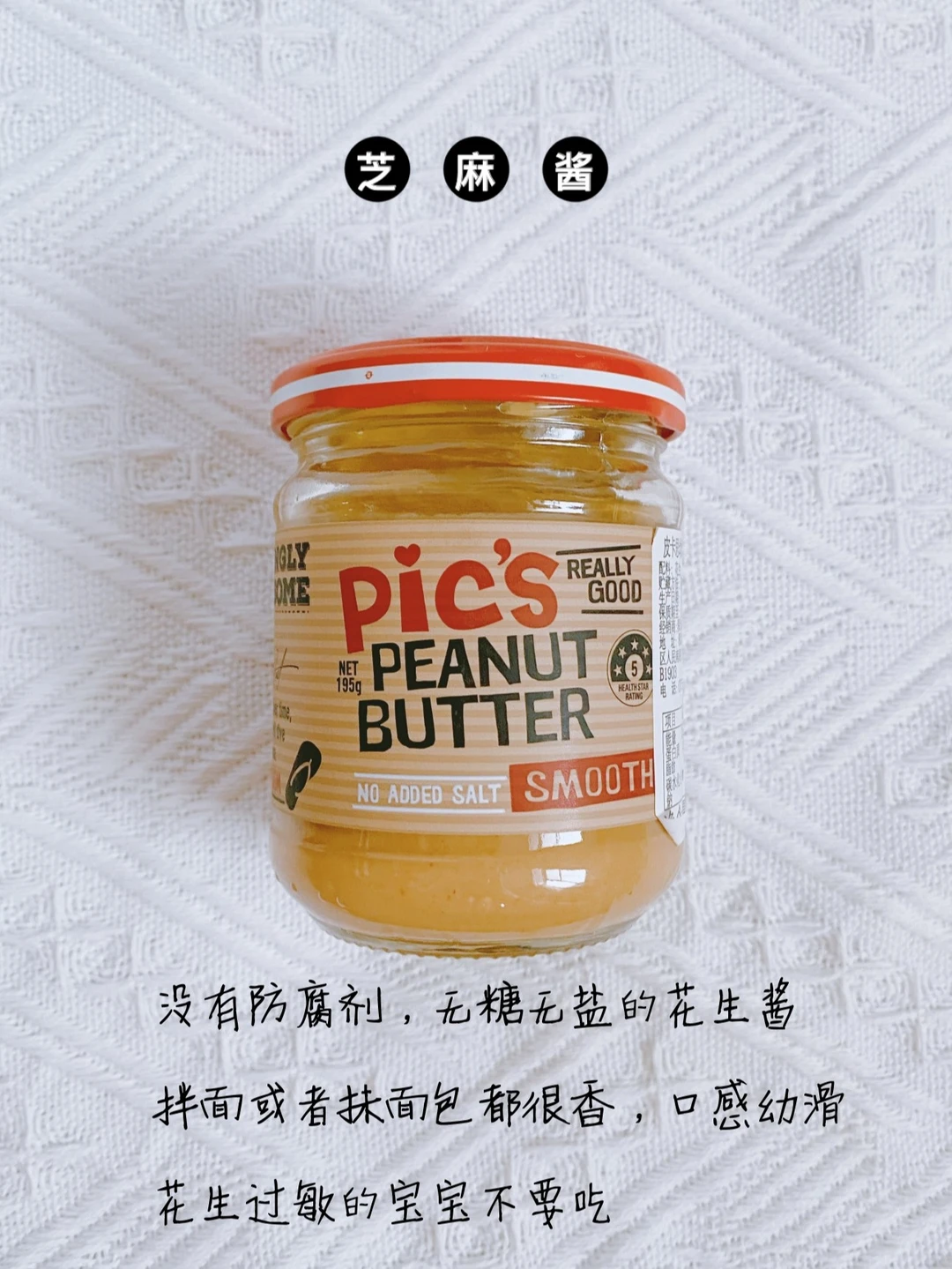 无盐无糖的花生酱,口感细腻,花生的香味很浓,不过敏的小宝宝也能吃。